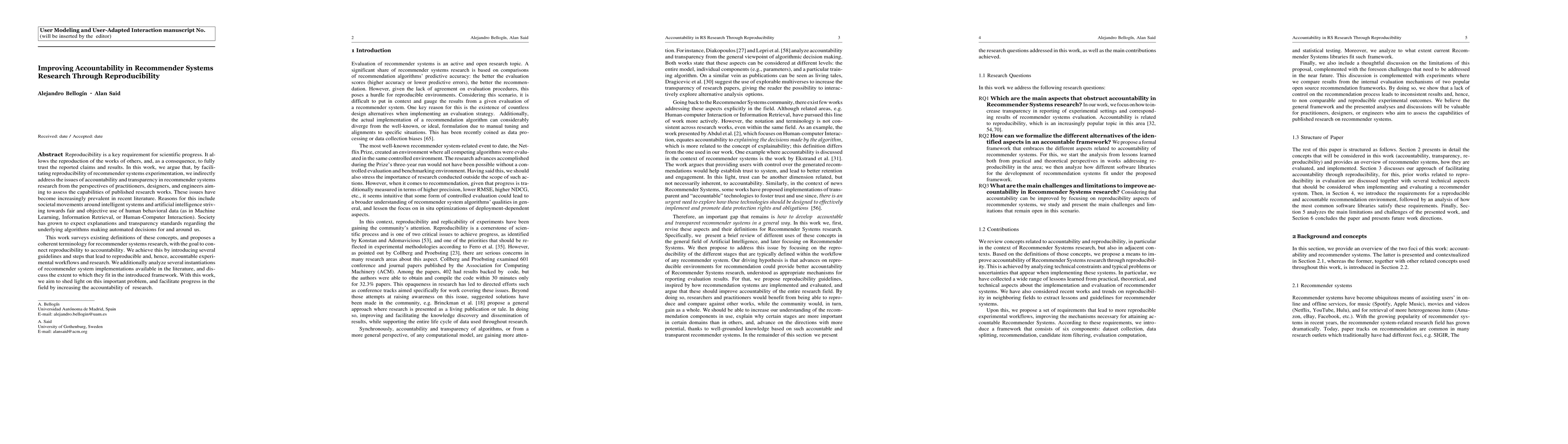 This paper argues that enhancing reproducibility in recommender systems research can improve accountability and transparency, addressing societal demands for fair and objective use of human behavioral data. It proposes a framework and guidelines to achieve reproducible experimental workflows, aiming to increase the credibility and accountability of research findings in the field.