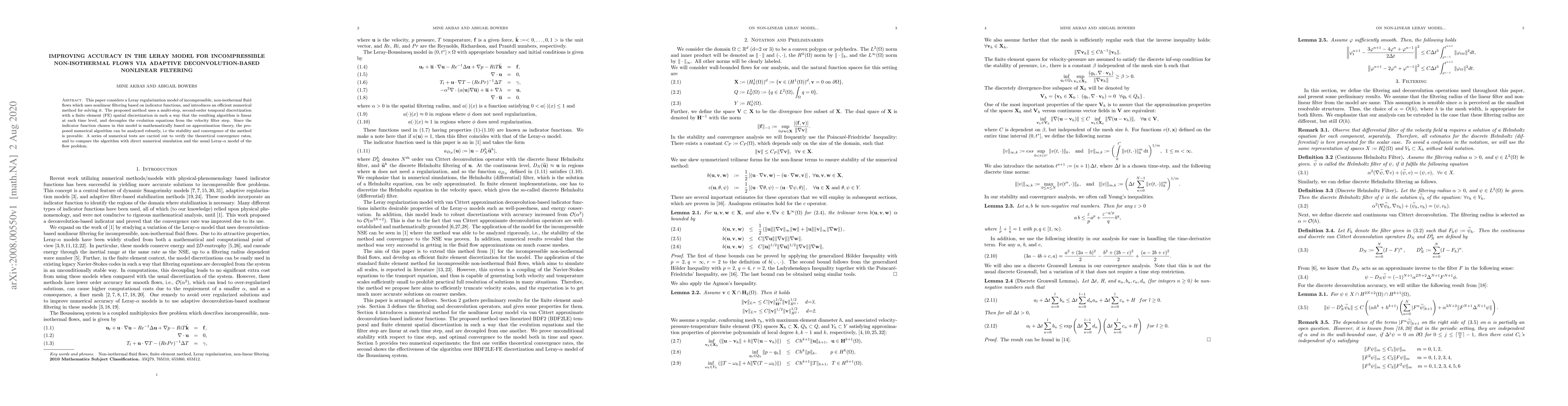 This paper considers a Leray regularization model of incompressible, non-isothermal fluid flows which uses nonlinear filtering based on indicator functions, and introduces an efficient numerical method for solving it. The proposed method uses a multi-step, second-order temporal discretization with a finite element (FE) spatial discretization in such a way that the resulting algorithm is linear at each time level, and decouples the evolution equations from the velocity filter step. Since the indicator function chosen in this model is mathematically based on approximation theory, the proposed numerical algorithm can be analyzed robustly, i.e the stability and convergence of the method is provable. A series of numerical tests are carried out to verify the theoretical convergence rates, and to compare the algorithm with direct numerical simulation and the usual Leray-$\alpha$ model of the flow problem.