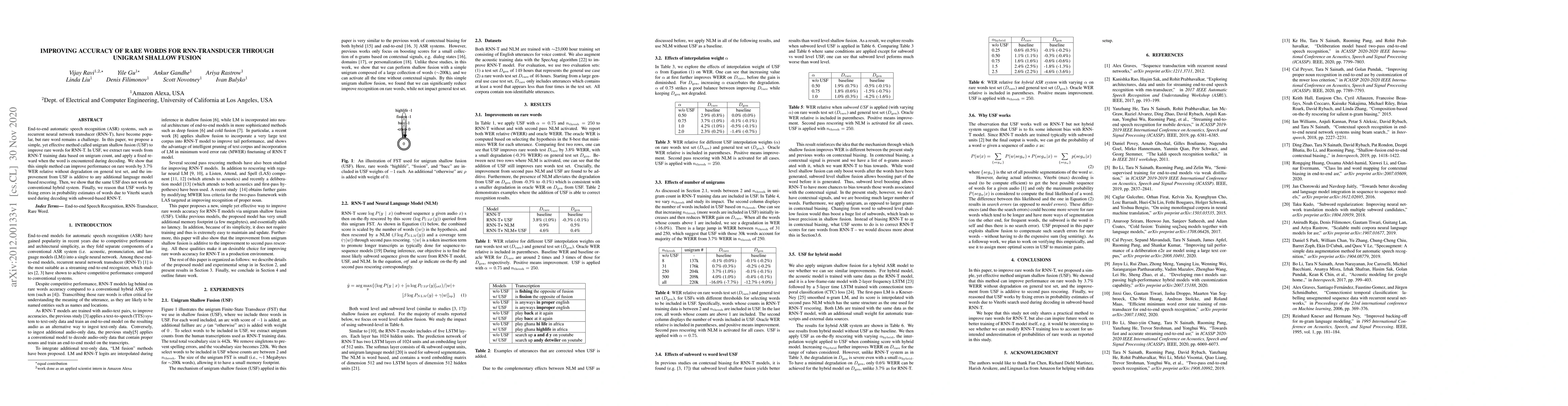 A simple method called unigram shallow fusion improves rare word accuracy in RNN-Transducer systems by 3.7% without degrading general test set performance. The method is additive to additional language model rescoring but does not work for conventional hybrid systems.