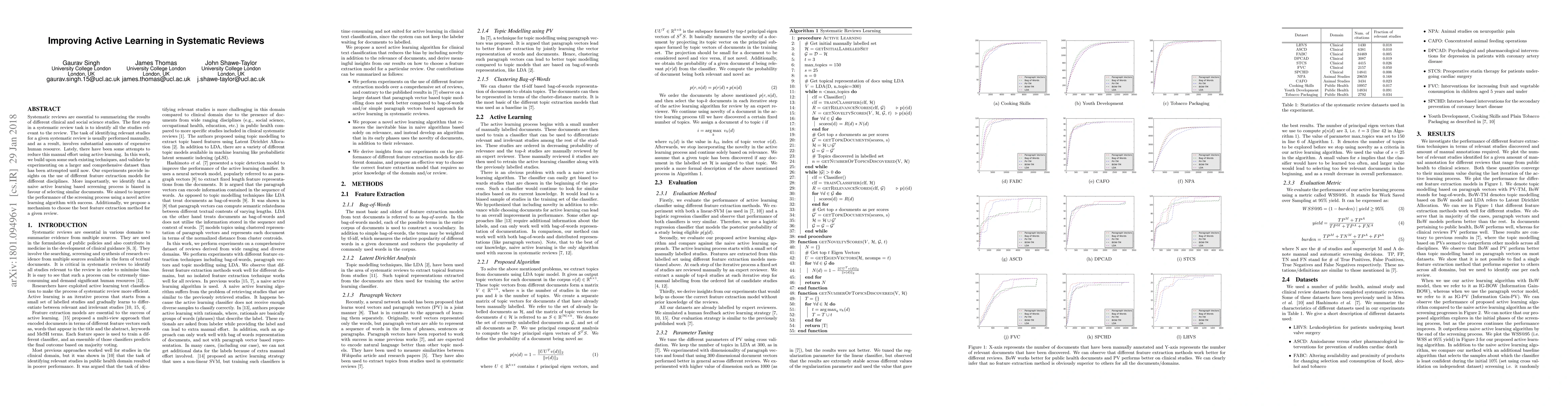 Systematic reviews are essential to summarizing the results of different clinical and social science studies. The first step in a systematic review task is to identify all the studies relevant to the review. The task of identifying relevant studies for a given systematic review is usually performed manually, and as a result, involves substantial amounts of expensive human resource. Lately, there have been some attempts to reduce this manual effort using active learning. In this work, we build upon some such existing techniques, and validate by experimenting on a larger and comprehensive dataset than has been attempted until now. Our experiments provide insights on the use of different feature extraction models for different disciplines. More importantly, we identify that a naive active learning based screening process is biased in favour of selecting similar documents. We aimed to improve the performance of the screening process using a novel active learning algorithm with success. Additionally, we propose a mechanism to choose the best feature extraction method for a given review.