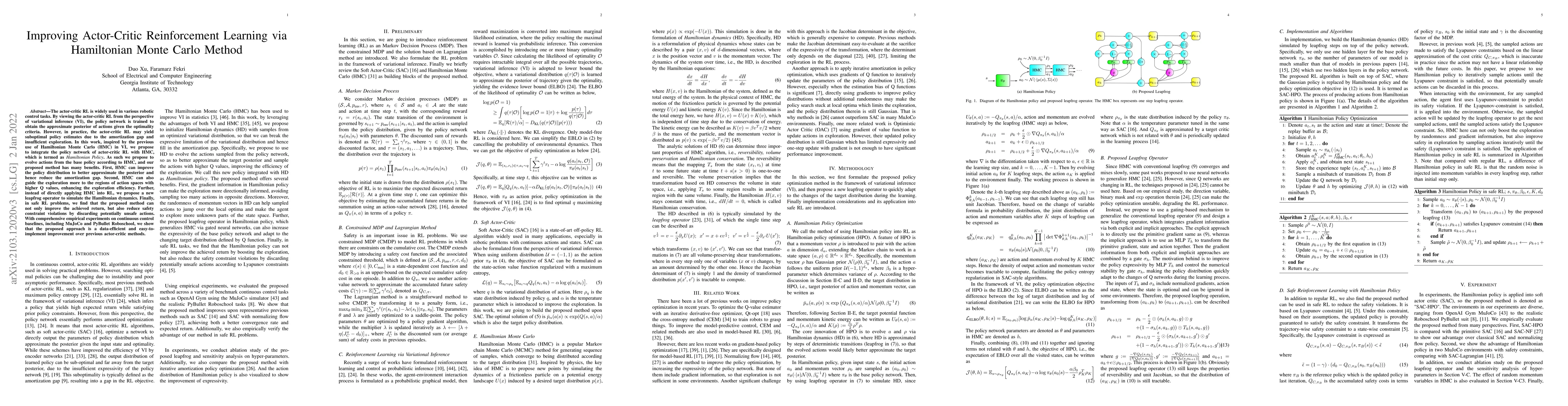 This paper proposes integrating Hamiltonian Monte Carlo (HMC) into the actor-critic reinforcement learning framework to enhance policy approximation and exploration efficiency. The method, termed "Hamiltonian Policy," employs a new leapfrog operator to simulate Hamiltonian dynamics, which helps reduce the amortization gap and guides exploration towards high-value regions, ultimately improving both performance and safety in control tasks.