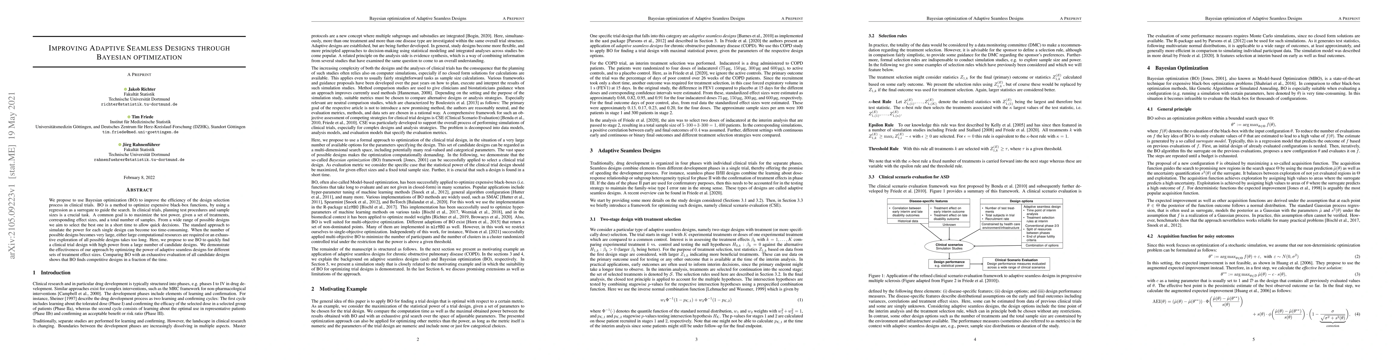 We propose to use Bayesian optimization (BO) to improve the efficiency of the design selection process in clinical trials. BO is a method to optimize expensive black-box functions, by using a regression as a surrogate to guide the search. In clinical trials, planning test procedures and sample sizes is a crucial task. A common goal is to maximize the test power, given a set of treatments, corresponding effect sizes, and a total number of samples. From a wide range of possible designs we aim to select the best one in a short time to allow quick decisions. The standard approach to simulate the power for each single design can become too time-consuming. When the number of possible designs becomes very large, either large computational resources are required or an exhaustive exploration of all possible designs takes too long. Here, we propose to use BO to quickly find a clinical trial design with high power from a large number of candidate designs. We demonstrate the effectiveness of our approach by optimizing the power of adaptive seamless designs for different sets of treatment effect sizes. Comparing BO with an exhaustive evaluation of all candidate designs shows that BO finds competitive designs in a fraction of the time.