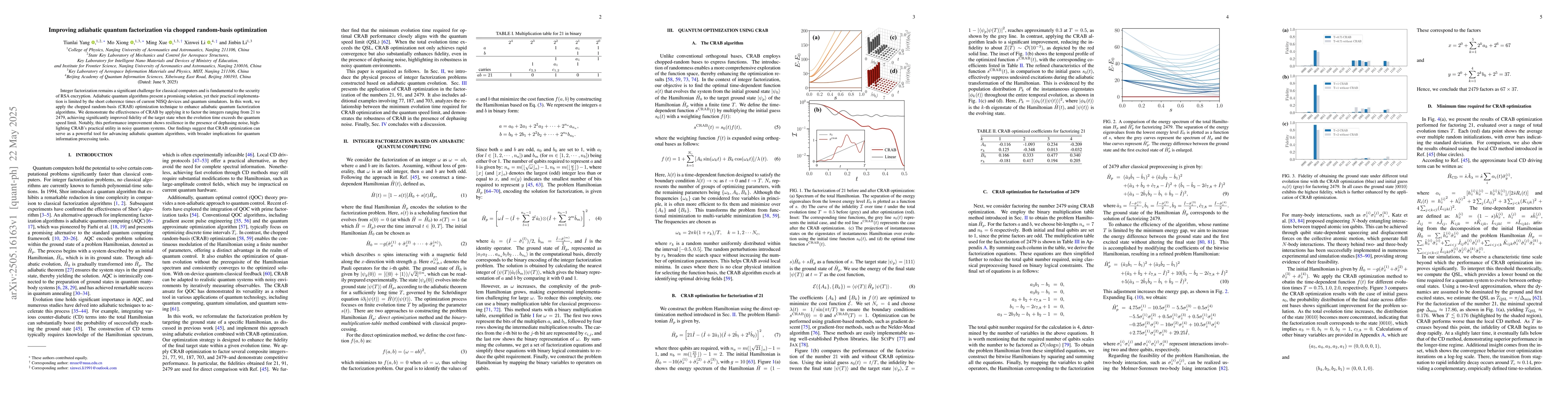 The development and demonstration of the chopped random-basis (CRAB) optimization technique for improving adiabatic quantum factorization algorithms in noisy quantum systems.