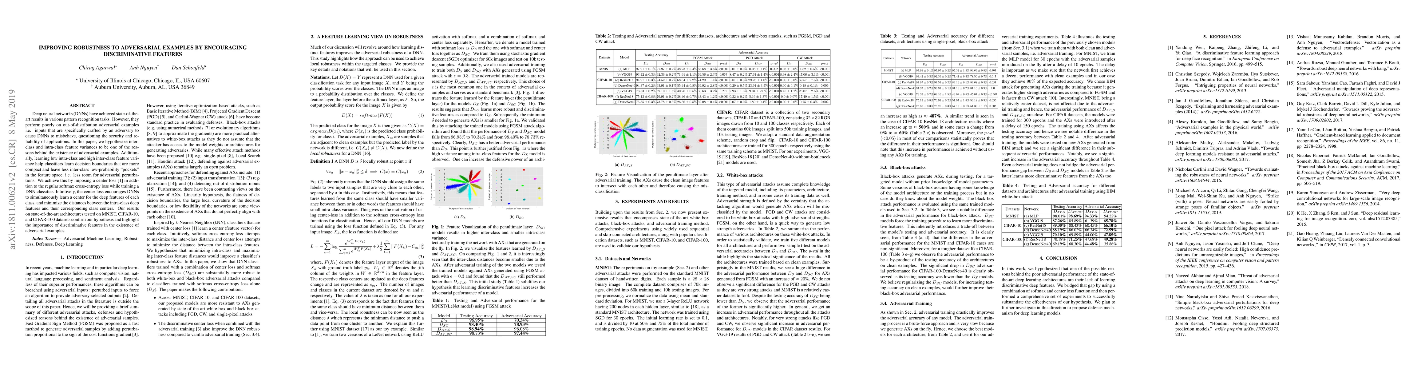 This paper proposes enhancing deep neural network robustness to adversarial examples by incorporating a center loss to encourage the learning of more discriminative features. The center loss aims to minimize intra-class feature distances and maximize inter-class feature distances, thereby improving adversarial robustness, as demonstrated on MNIST, CIFAR-10, and CIFAR-100 datasets.