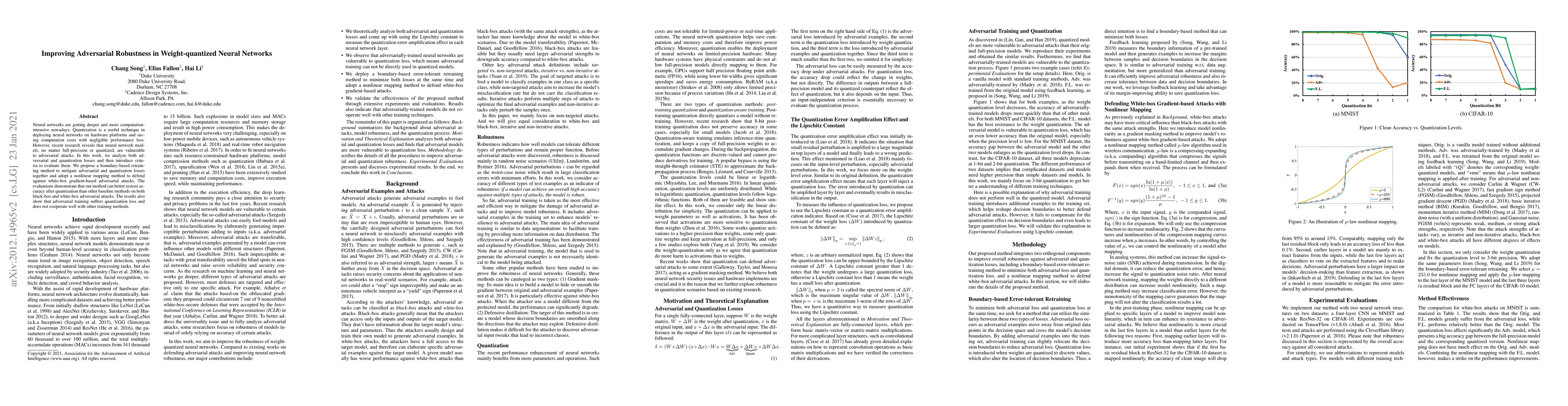 This paper proposes a boundary-based retraining method to improve the adversarial robustness of weight-quantized neural networks, combining it with a nonlinear mapping technique to defend against gradient-based attacks. The method effectively restores accuracy post-quantization, outperforming baselines in both black-box and white-box adversarial settings.