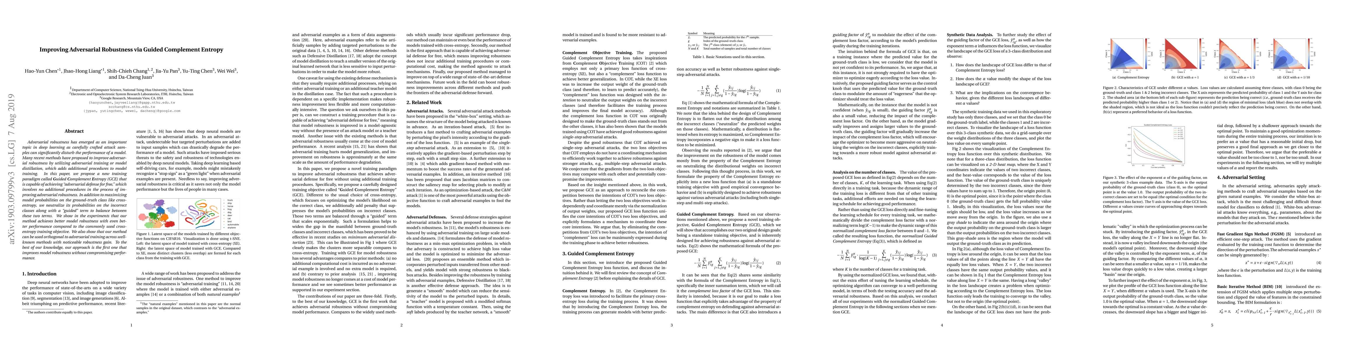 This paper introduces Guided Complement Entropy (GCE) to enhance adversarial robustness without additional training procedures, balancing ground-truth and incorrect class probabilities for improved model robustness and performance. The method shows superior results compared to cross-entropy training and can complement adversarial training methods.