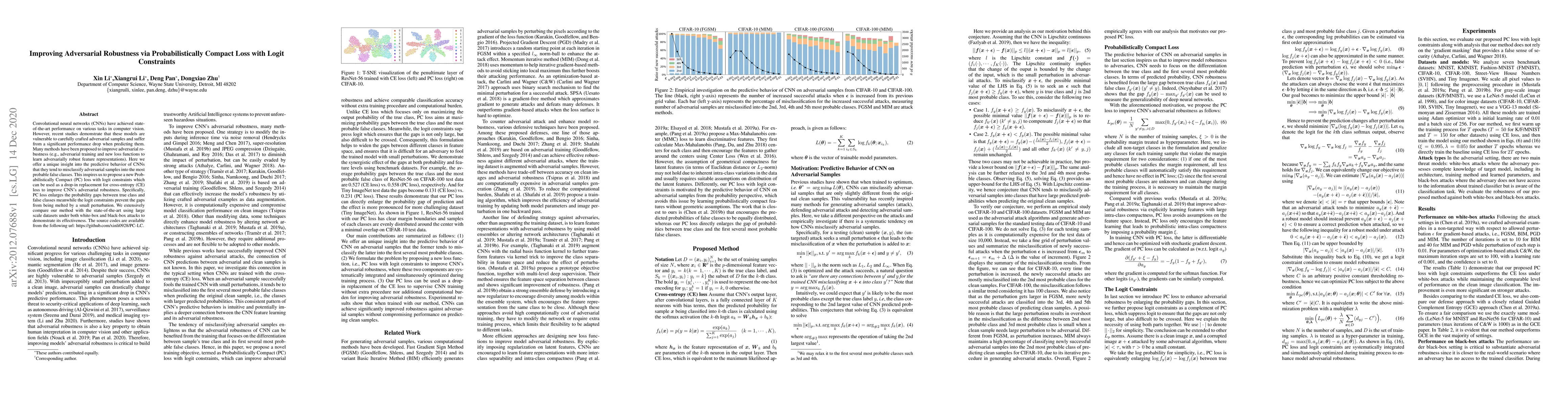 This paper proposes a Probabilistically Compact (PC) loss with logit constraints to enhance the adversarial robustness of convolutional neural networks (CNNs). The method enlarges the probability gaps between true and false classes while preventing these gaps from being eroded by adversarial perturbations, demonstrating improved performance against both white-box and black-box attacks.