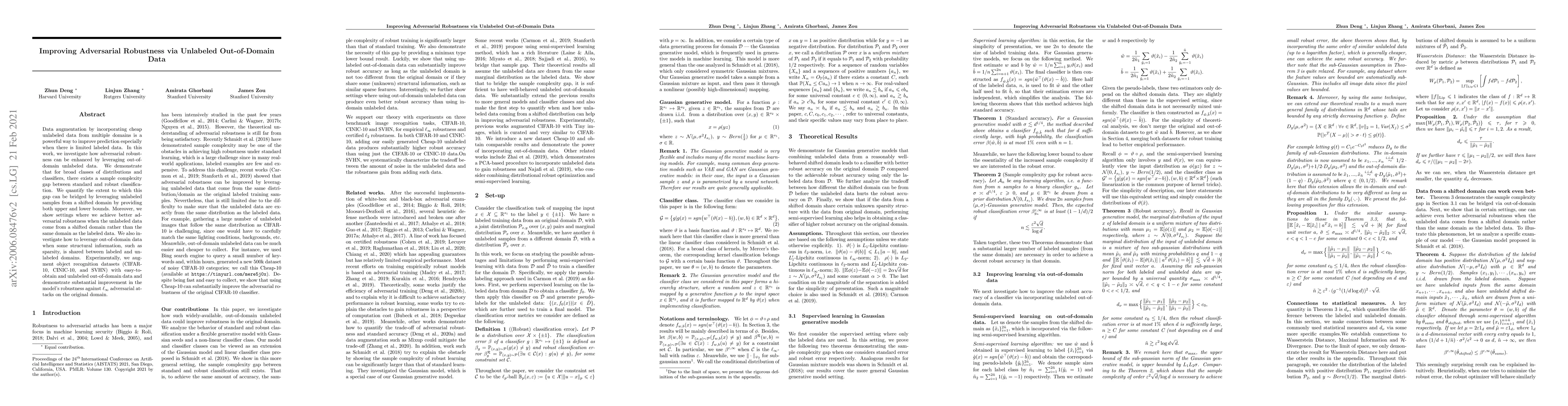 This paper explores enhancing adversarial robustness through the use of unlabeled out-of-domain data for data augmentation, showing that such data can bridge the sample complexity gap between standard and robust classifiers. Experimental results on CIFAR-10 and SVHN datasets demonstrate significant improvements in robustness against $\ell_\infty$ adversarial attacks.