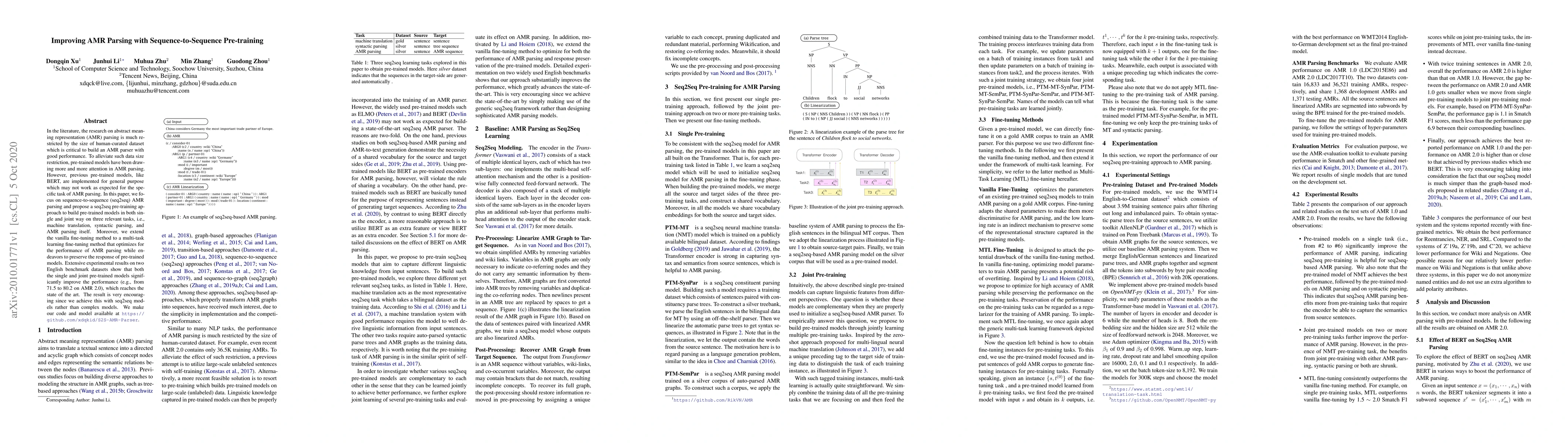 This paper proposes a sequence-to-sequence pre-training approach for improving AMR parsing, leveraging machine translation, syntactic parsing, and AMR parsing tasks to build pre-trained models. Experimental results show significant performance improvements, reaching state-of-the-art results on benchmark datasets.