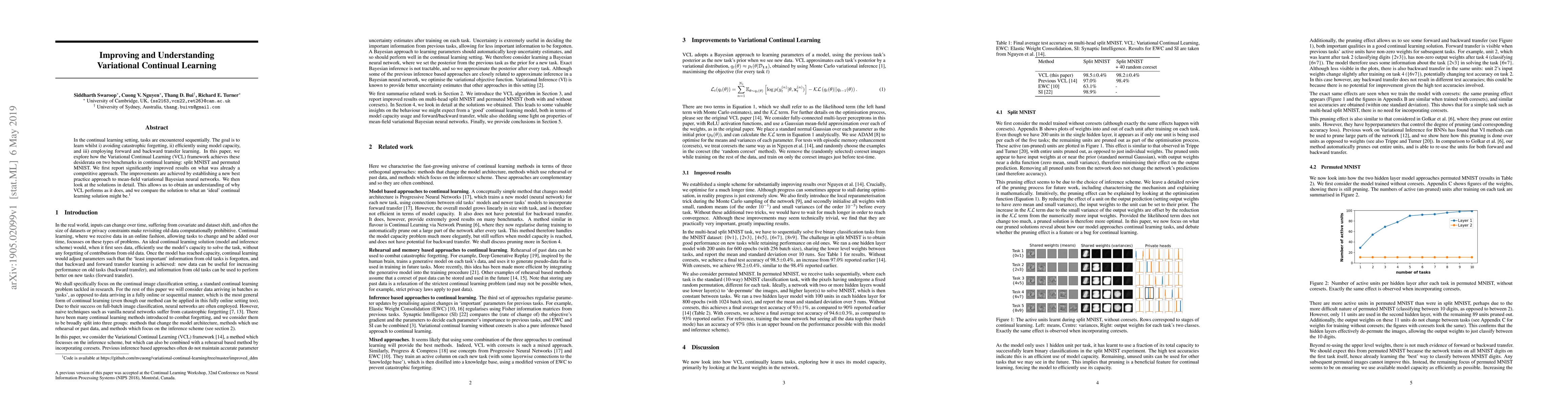 The paper presents a new best practice approach to mean-field variational Bayesian neural networks, significantly improving Variational Continual Learning (VCL) performance on split MNIST and permuted MNIST benchmarks.