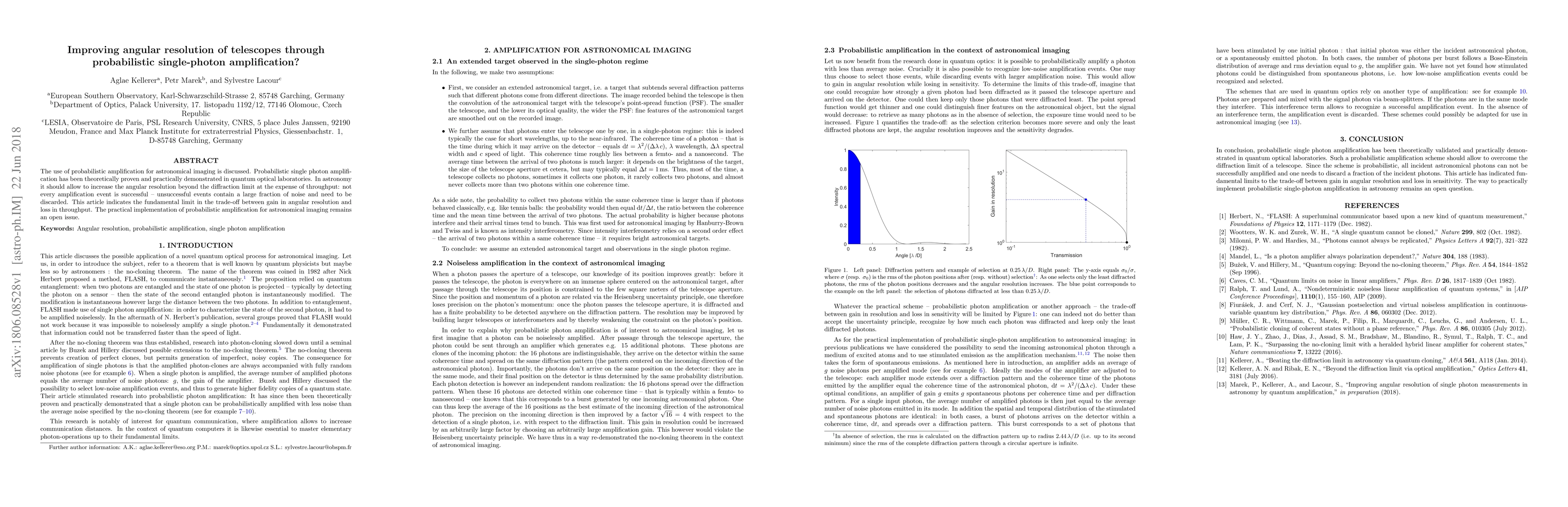 Researchers explore a way to improve telescope resolution using probabilistic single-photon amplification, which could surpass the diffraction limit but reduces throughput. The practical application of this method remains an open issue.