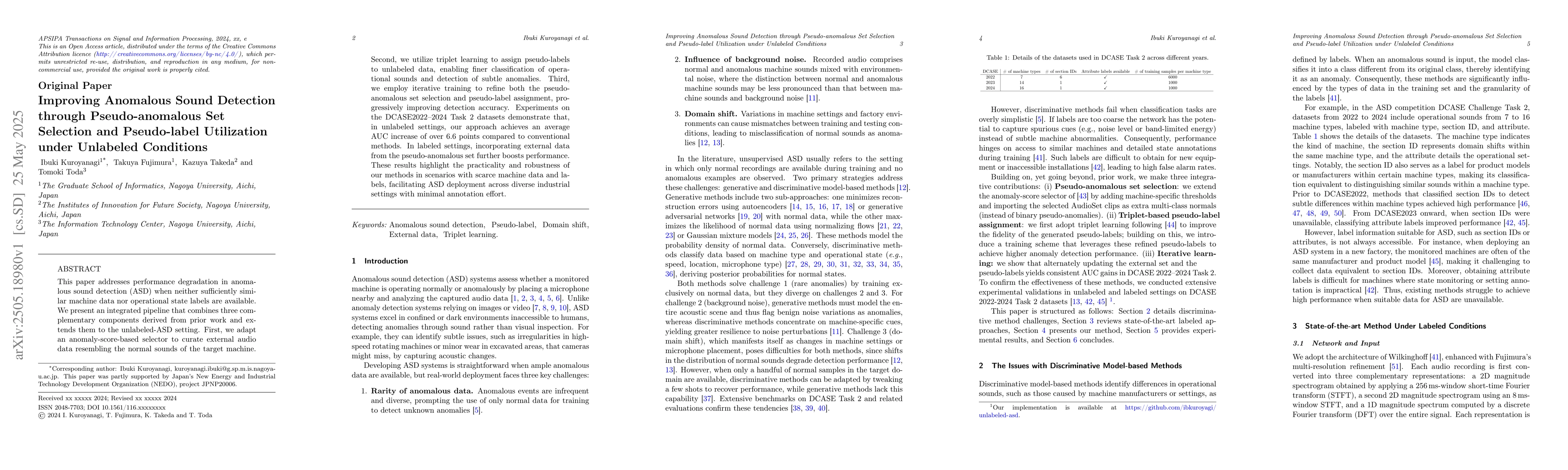 This work extends prior research to unlabeled ASD settings, introducing an iterative training process to progressively improve detection accuracy using pseudo-anomalous sets and pseudo-labels, which sets it apart from existing methods.
