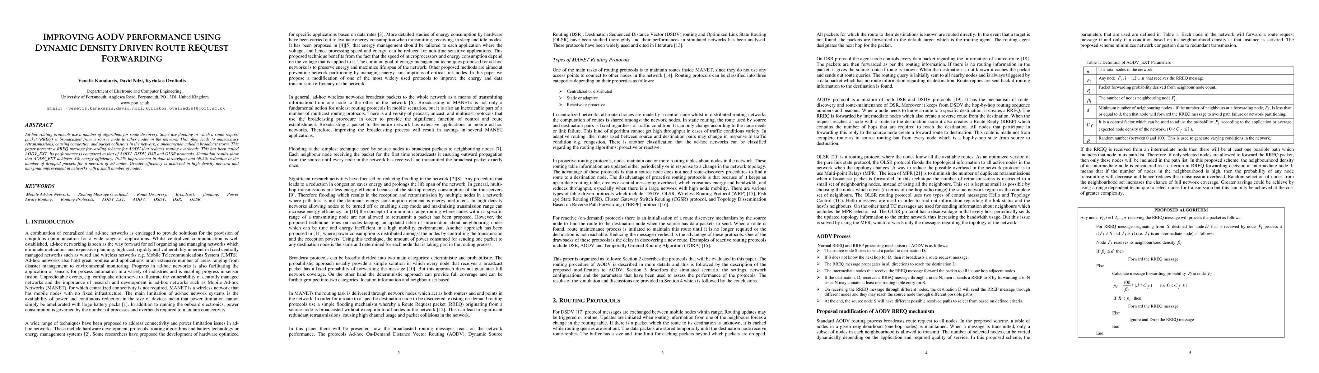This paper proposes AODV_EXT, a dynamic density-driven route request forwarding scheme for improving AODV performance in ad-hoc networks. Simulation results show AODV_EXT achieves 3% energy efficiency, 19.5% higher data throughput, and a 69.5% reduction in dropped packets compared to AODV, DSDV, DSR, and OLSR protocols.