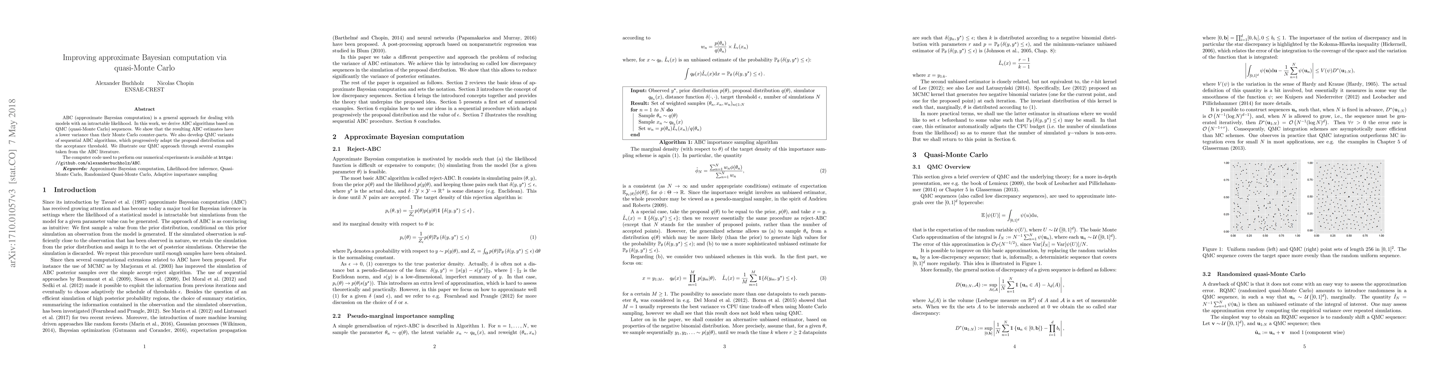 This paper proposes ABC algorithms based on quasi-Monte Carlo sequences to improve approximate Bayesian computation, demonstrating lower variance estimates compared to Monte Carlo methods. It also introduces adaptive variants of these algorithms, showcasing their effectiveness through examples from the literature.