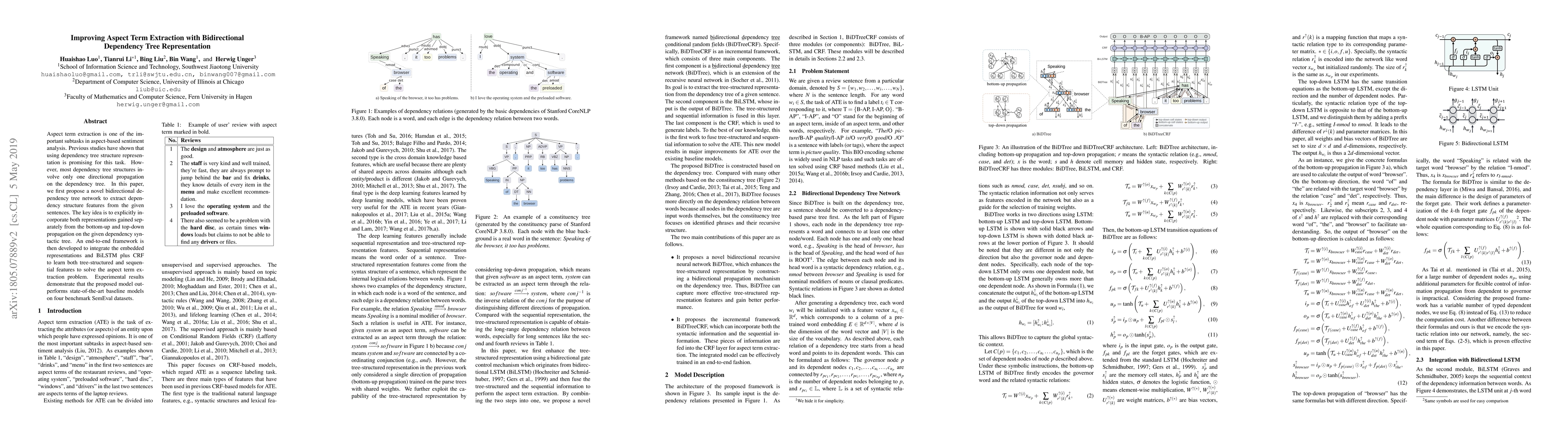 This paper proposes a novel bidirectional dependency tree network to enhance aspect term extraction in aspect-based sentiment analysis, integrating both bottom-up and top-down representations. The model outperforms existing methods on four benchmark datasets.