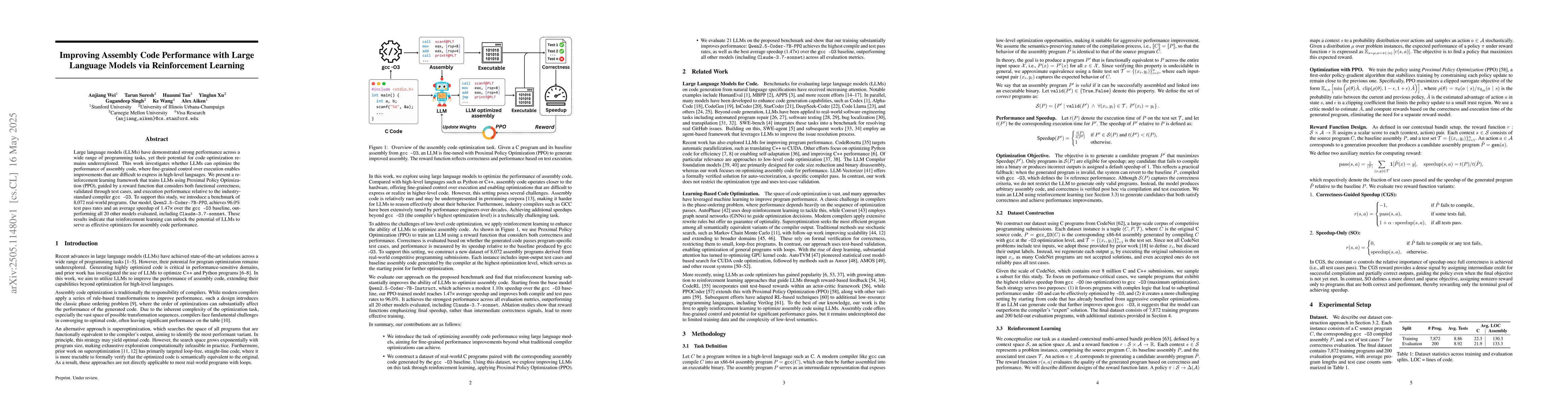 This work is novel in applying reinforcement learning to LLMs for assembly code optimization, significantly outperforming existing models and industry-standard compilers.