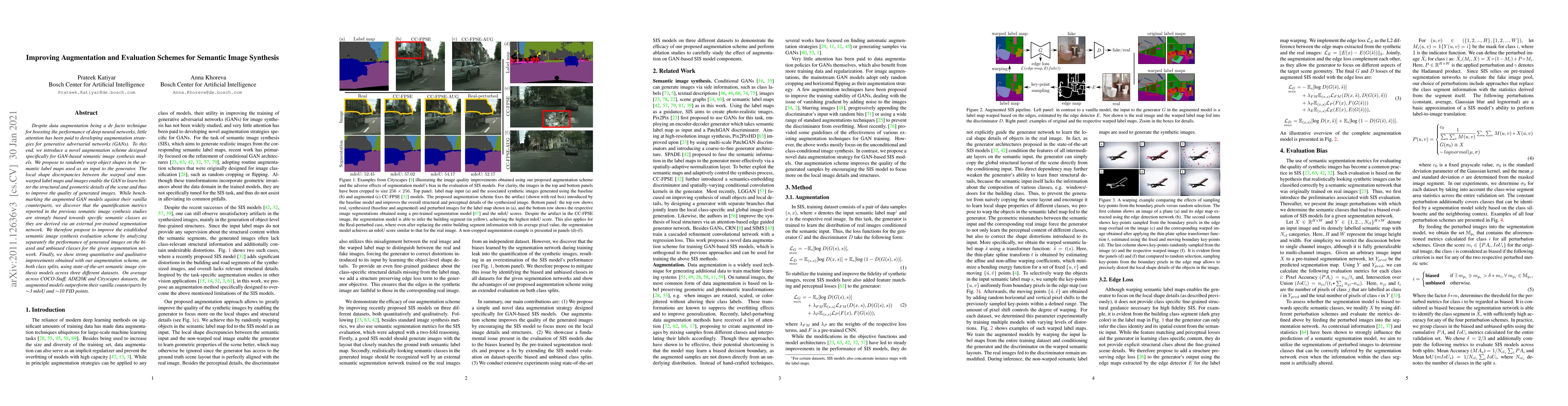 This paper introduces a novel augmentation scheme for GAN-based semantic image synthesis, which warps object shapes in label maps to enhance structural learning. It also proposes an improved evaluation scheme to address biases in existing metrics, showing significant improvements in both quantitative and qualitative metrics across three datasets.