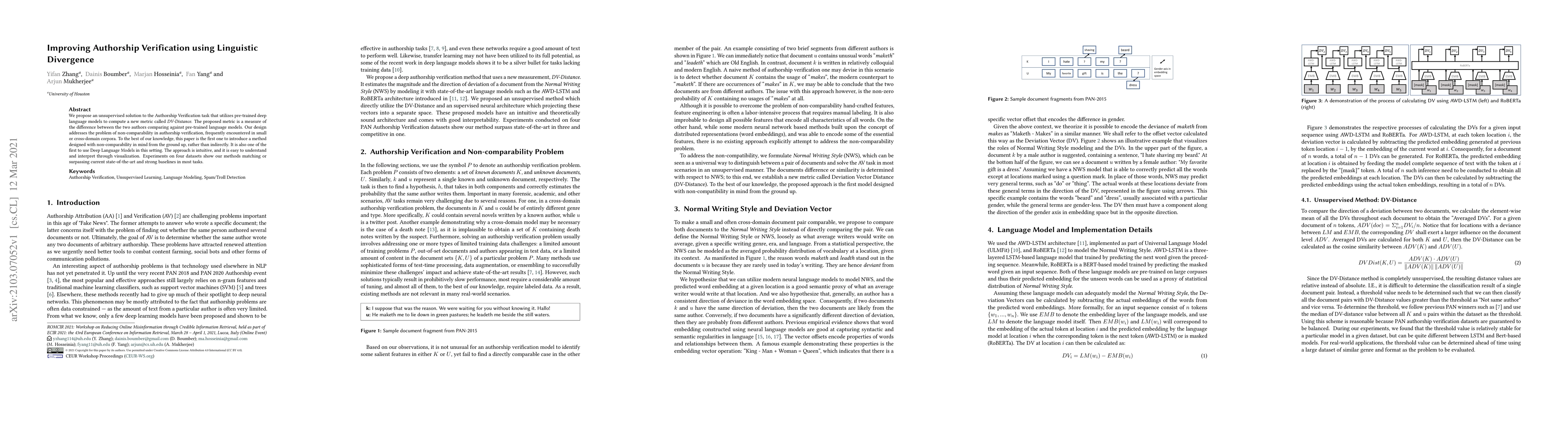 This paper proposes an unsupervised method for authorship verification using a new metric, DV-Distance, which measures linguistic divergence between authors with pre-trained deep language models. The approach effectively addresses non-comparability issues in small or cross-domain corpora, outperforming current state-of-the-art methods in experiments.