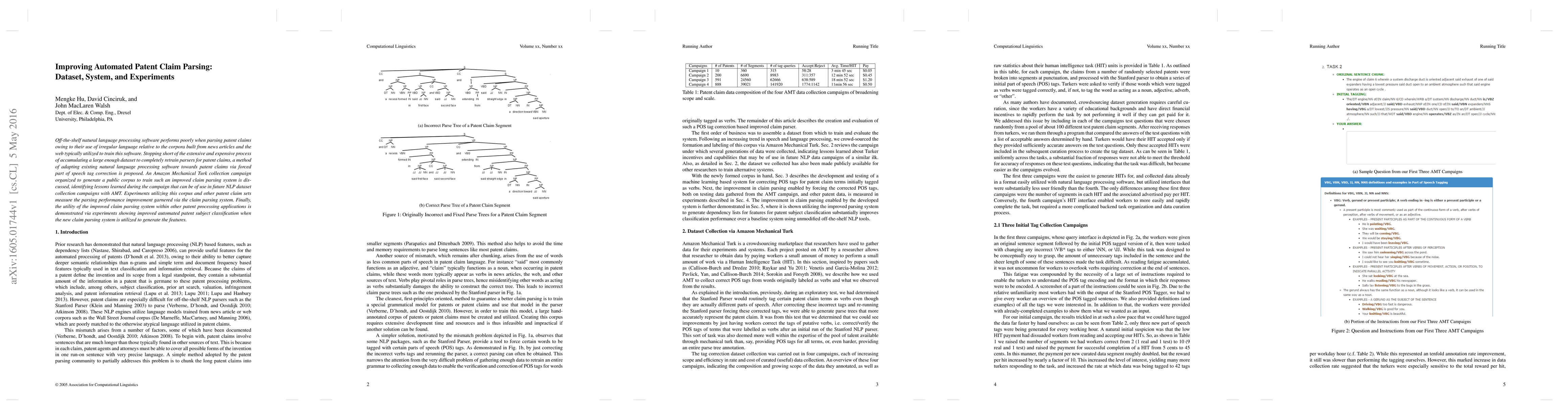 Off-the-shelf natural language processing software performs poorly when parsing patent claims owing to their use of irregular language relative to the corpora built from news articles and the web typically utilized to train this software. Stopping short of the extensive and expensive process of accumulating a large enough dataset to completely retrain parsers for patent claims, a method of adapting existing natural language processing software towards patent claims via forced part of speech tag correction is proposed. An Amazon Mechanical Turk collection campaign organized to generate a public corpus to train such an improved claim parsing system is discussed, identifying lessons learned during the campaign that can be of use in future NLP dataset collection campaigns with AMT. Experiments utilizing this corpus and other patent claim sets measure the parsing performance improvement garnered via the claim parsing system. Finally, the utility of the improved claim parsing system within other patent processing applications is demonstrated via experiments showing improved automated patent subject classification when the new claim parsing system is utilized to generate the features.