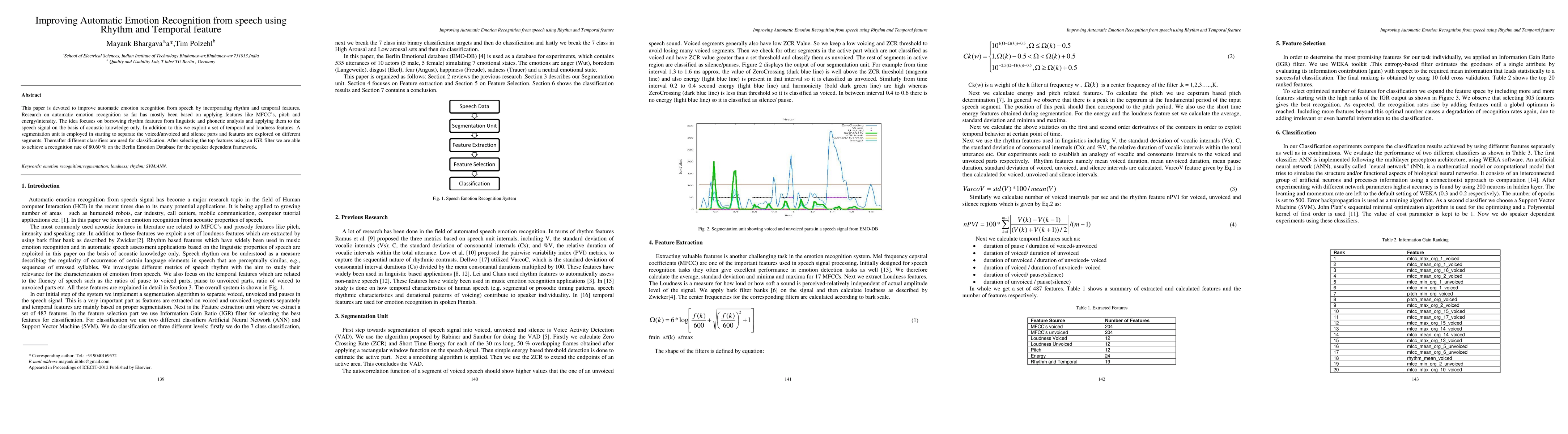 This paper enhances automatic emotion recognition from speech by integrating rhythm and temporal features, achieving a recognition rate of 80.60% on the Berlin Emotion Database using a combination of linguistic, phonetic, and temporal features, alongside a segmentation unit for feature extraction.