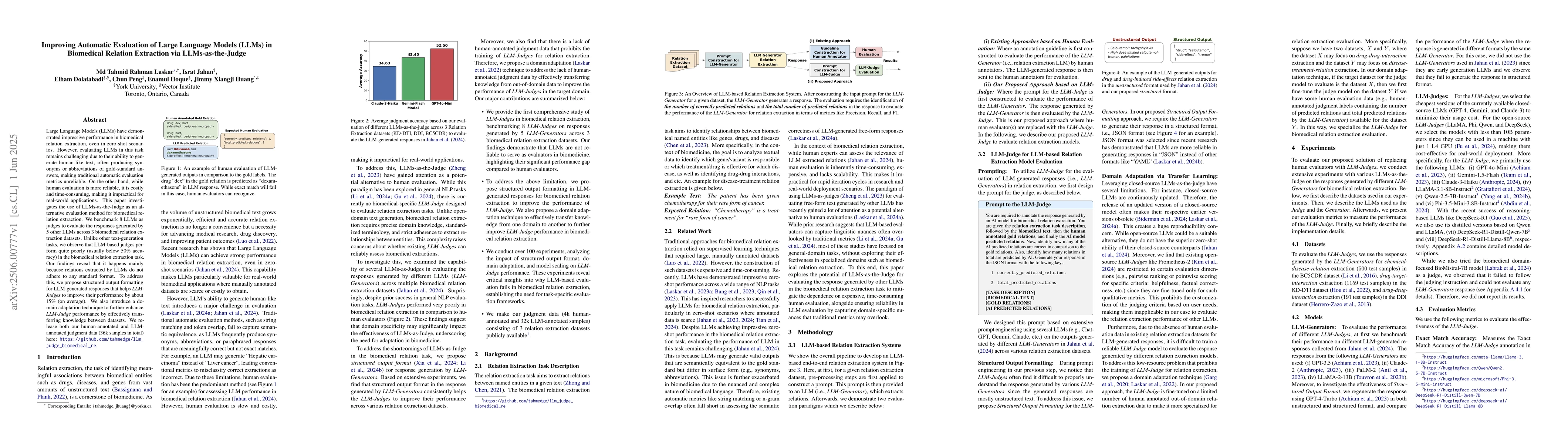 The paper benchmarks 8 LLMs as judges to evaluate the responses generated by 5 other LLMs across 3 biomedical relation extraction datasets, proposing structured output formatting and domain adaptation techniques to improve LLM-judge performance.