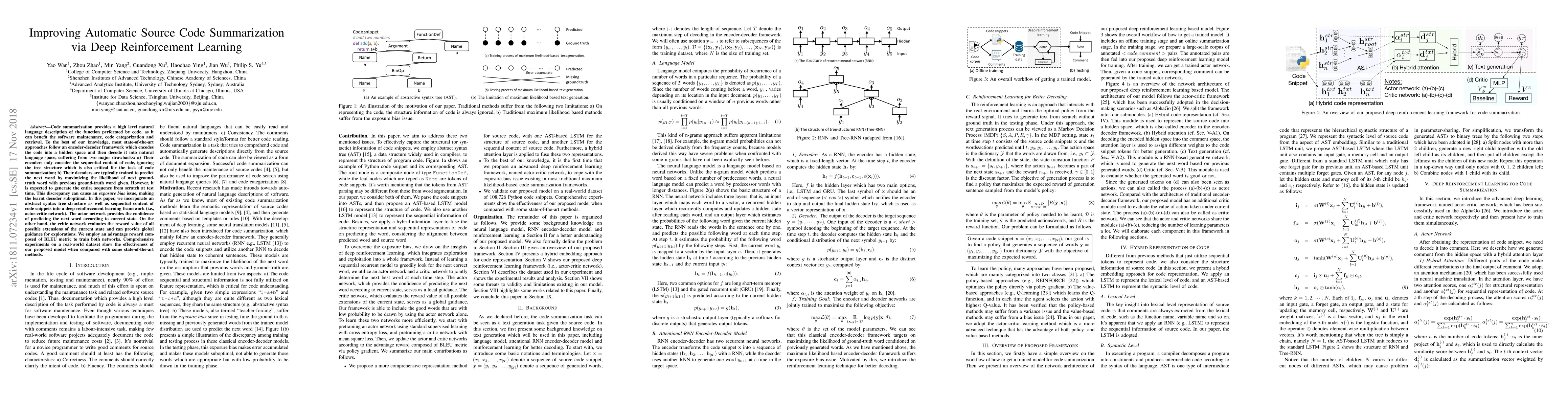 This paper proposes a new deep reinforcement learning model for automatic source code summarization that incorporates both sequential content and abstract syntax tree structure, achieving better performance than state-of-the-art methods.