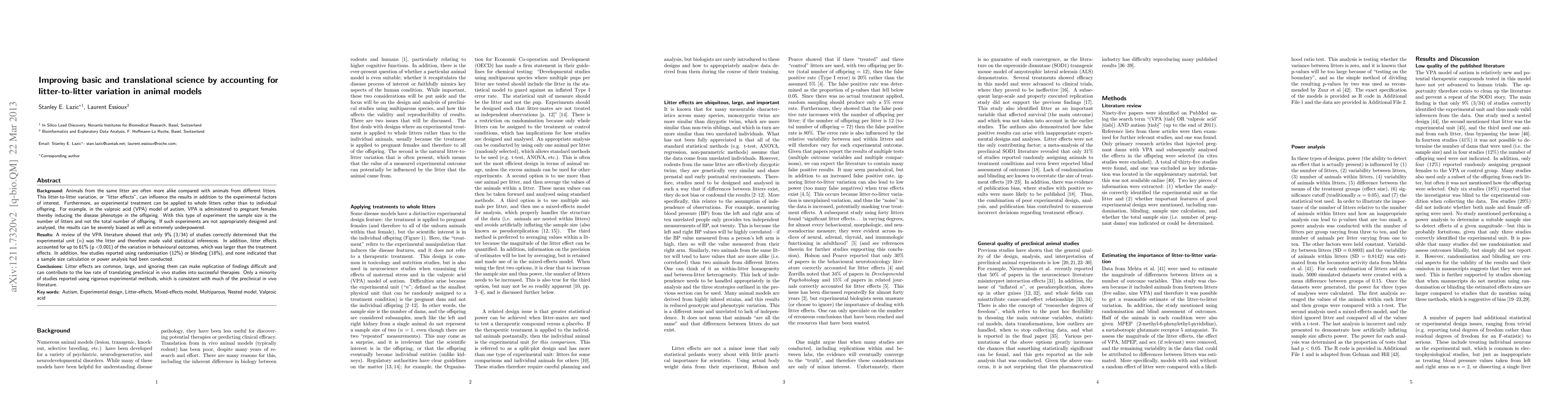 This paper highlights the significant impact of litter-to-litter variation in animal models, demonstrating that only 9% of studies correctly identify litter as the experimental unit, leading to biased results and underpowered experiments. The review emphasizes the need for rigorous experimental design and analysis to improve the reproducibility and translation of preclinical studies.
