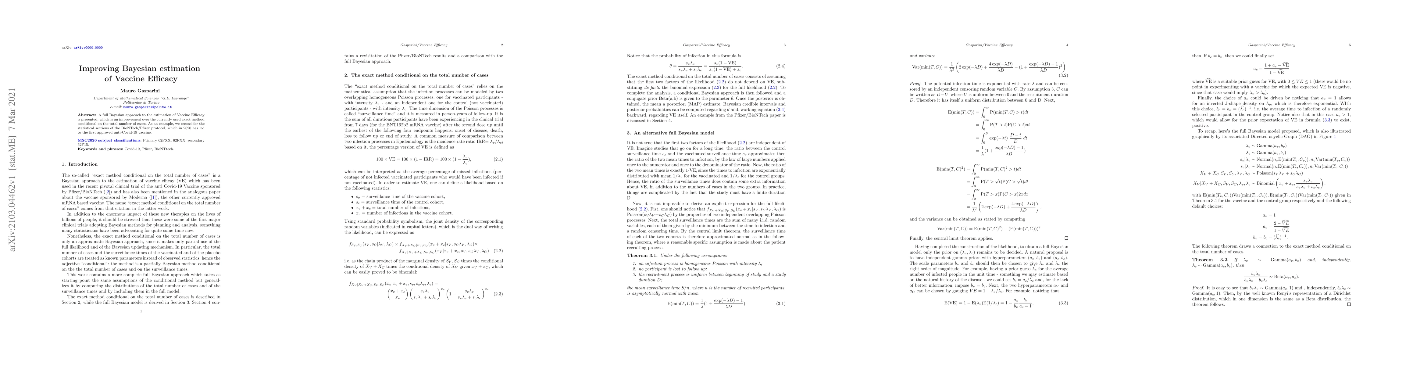 This paper introduces a full Bayesian method for estimating vaccine efficacy, surpassing the traditional exact method. It applies this improved approach to reassess the statistical analysis of the BioNTech/Pfizer COVID-19 vaccine trial, which was pivotal in the first approved anti-Covid-19 vaccine.