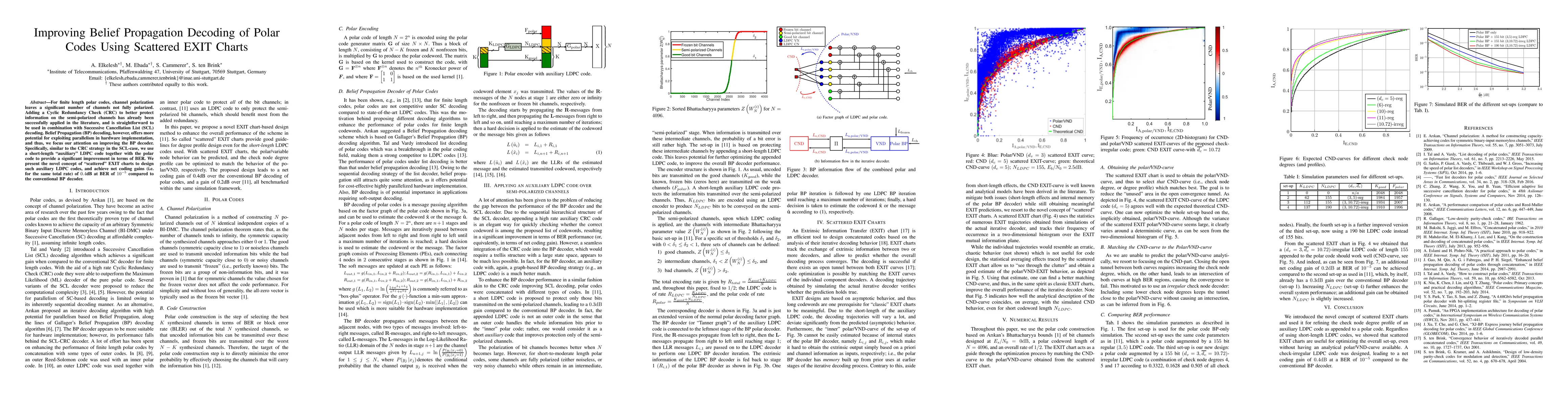 This paper proposes an enhancement to Belief Propagation decoding for polar codes by using a short-length auxiliary LDPC code, achieving a net coding gain of 0.4 dB at BER of 1E-5. The method employs "scattered" EXIT charts to design the auxiliary LDPC code, improving performance on semi-polarized channels.
