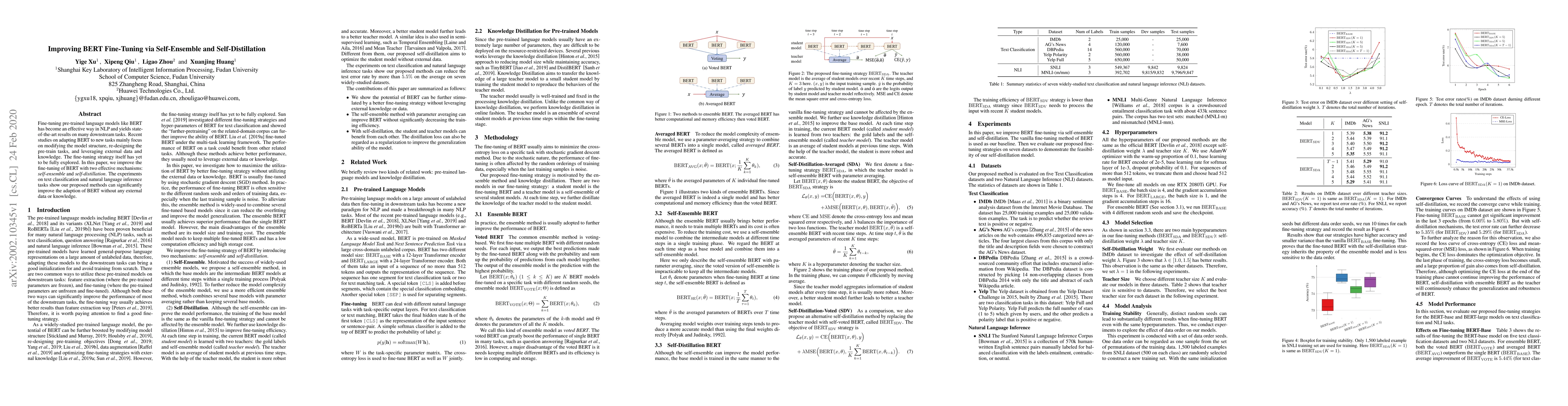 This paper introduces self-ensemble and self-distillation techniques to enhance the fine-tuning of BERT, leading to significant improvements in text classification and natural language inference tasks without using external data or knowledge.