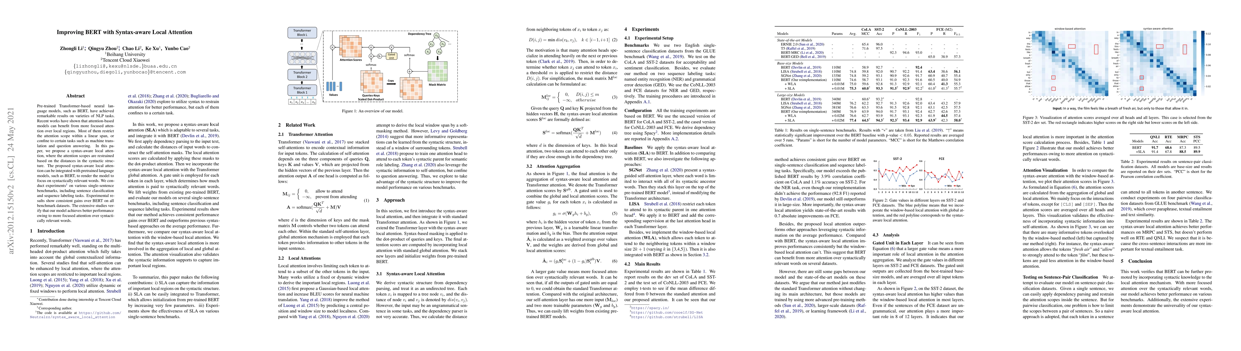 This paper proposes a syntax-aware local attention mechanism to enhance BERT by focusing attention on syntactically relevant words based on syntactic structure distances. Experiments on various NLP tasks show consistent improvements over BERT, demonstrating the benefits of more focused attention on syntactically relevant regions.