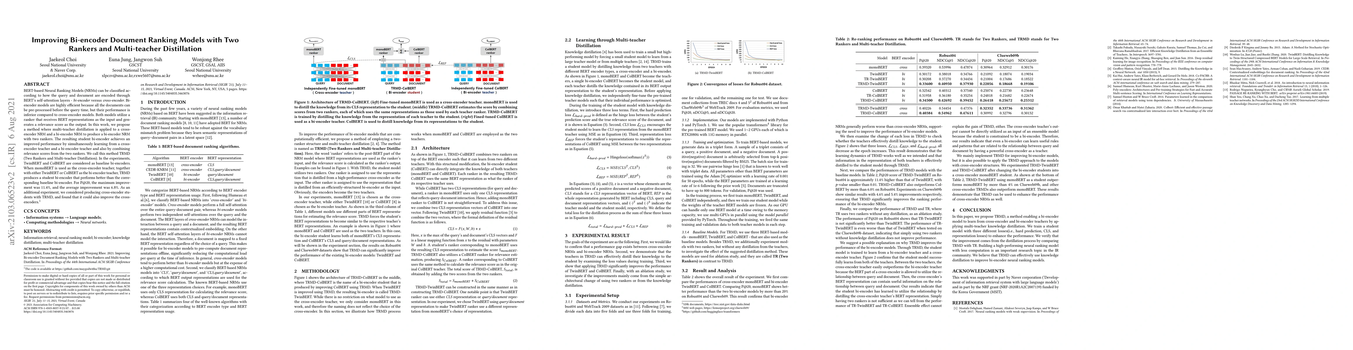 This paper proposes TRMD, a method combining two rankers and multi-teacher distillation to improve bi-encoder document ranking models. The student bi-encoder learns from both a cross-encoder and a bi-encoder teacher, achieving up to 11.4% improvement over baseline bi-encoders for P@20.