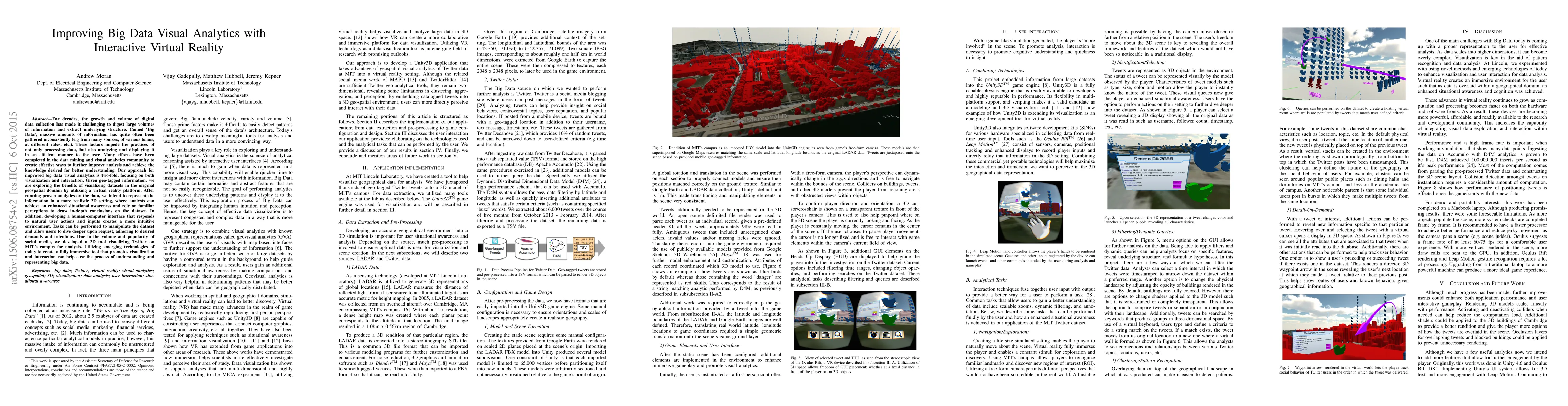 This paper explores enhancing big data visual analytics through interactive virtual reality, focusing on geospatial data visualization and intuitive human-computer interaction. A 3D tool for visualizing Twitter data on MIT's campus demonstrates the potential of immersive environments to improve understanding and analysis of large datasets.