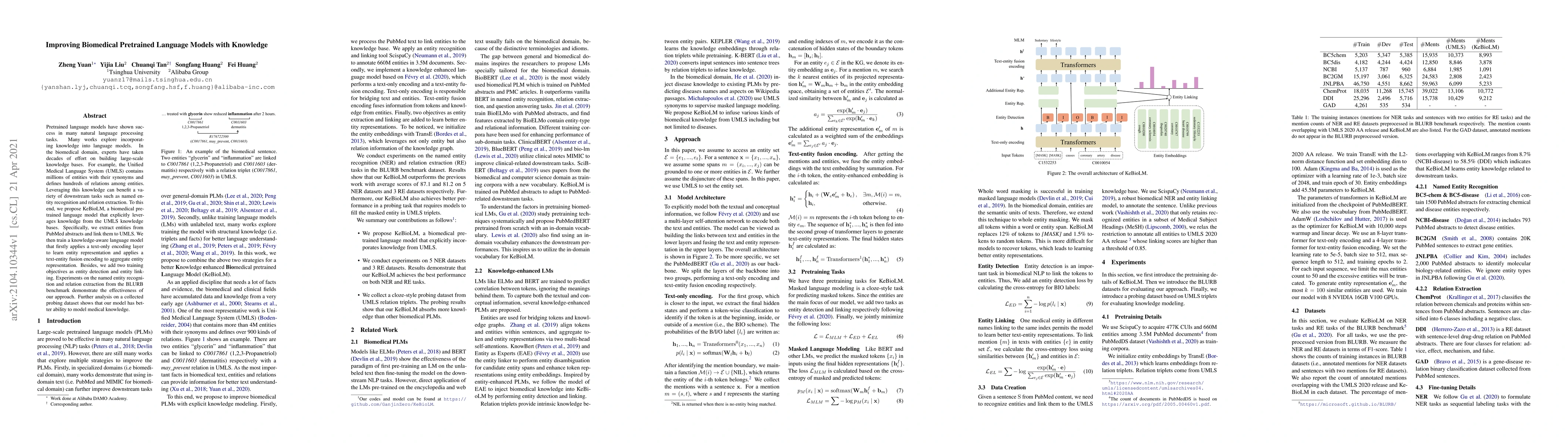 This paper proposes KeBioLM, a biomedical pretrained language model that incorporates knowledge from the Unified Medical Language System (UMLS) to improve named entity recognition and relation extraction. The model uses a text-entity fusion approach and additional training objectives for entity detection and linking, showing improved performance on relevant tasks.