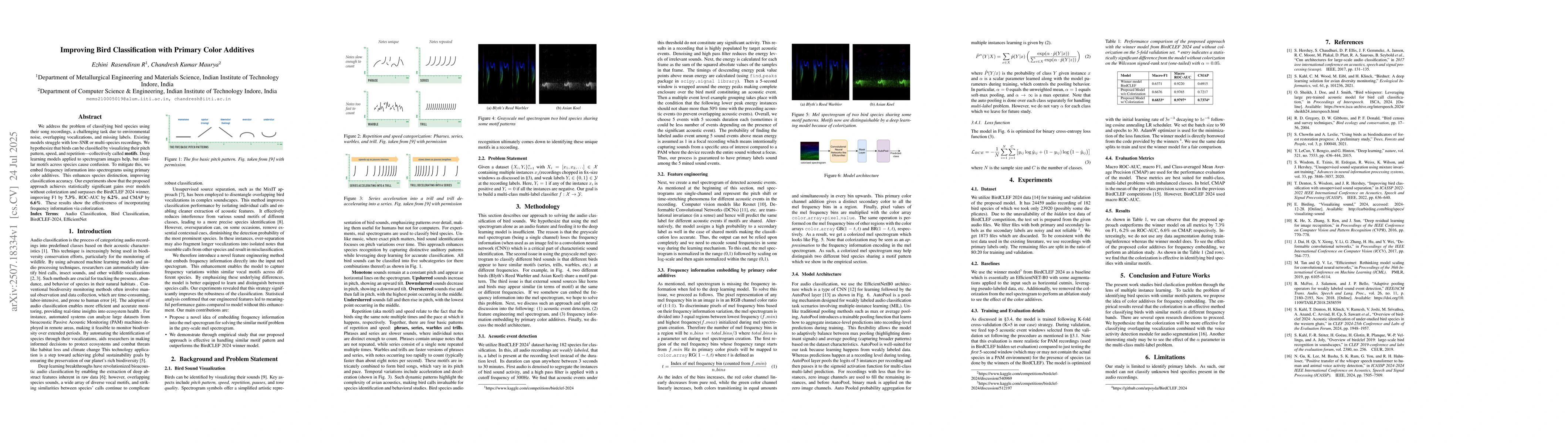 We address the problem of classifying bird species using their song recordings, a challenging task due to environmental noise, overlapping vocalizations, and missing labels. Existing models struggle with low-SNR or multi-species recordings. We hypothesize that birds can be classified by visualizing their pitch pattern, speed, and repetition, collectively called motifs. Deep learning models applied to spectrogram images help, but similar motifs across species cause confusion. To mitigate this, we embed frequency information into spectrograms using primary color additives. This enhances species distinction and improves classification accuracy. Our experiments show that the proposed approach achieves statistically significant gains over models without colorization and surpasses the BirdCLEF 2024 winner, improving F1 by 7.3%, ROC-AUC by 6.2%, and CMAP by 6.6%. These results demonstrate the effectiveness of incorporating frequency information via colorization.