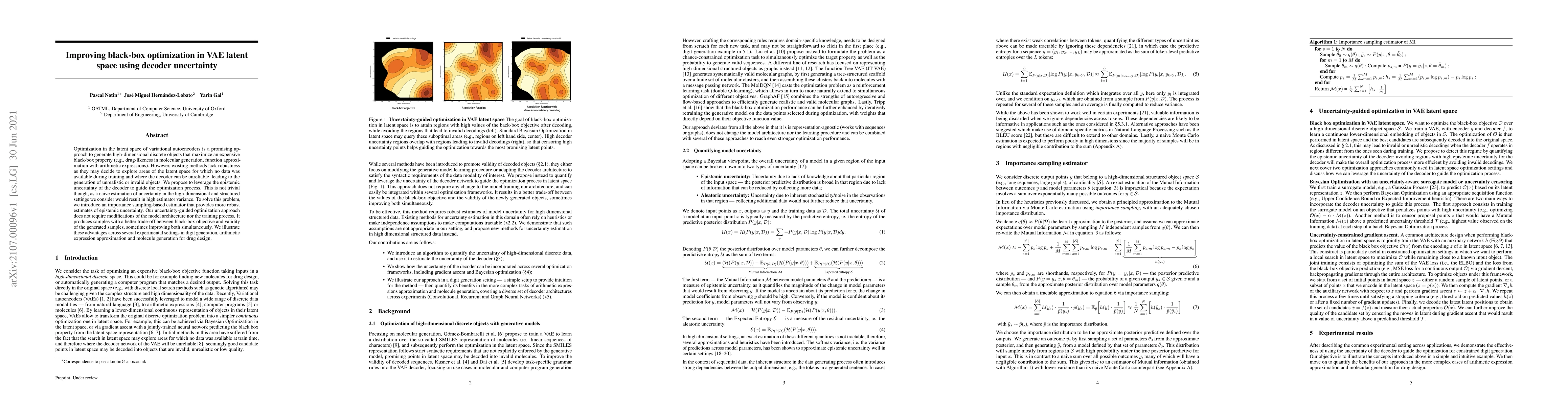 Optimization in the latent space of variational autoencoders is a promising approach to generate high-dimensional discrete objects that maximize an expensive black-box property (e.g., drug-likeness in molecular generation, function approximation with arithmetic expressions). However, existing methods lack robustness as they may decide to explore areas of the latent space for which no data was available during training and where the decoder can be unreliable, leading to the generation of unrealistic or invalid objects. We propose to leverage the epistemic uncertainty of the decoder to guide the optimization process. This is not trivial though, as a naive estimation of uncertainty in the high-dimensional and structured settings we consider would result in high estimator variance. To solve this problem, we introduce an importance sampling-based estimator that provides more robust estimates of epistemic uncertainty. Our uncertainty-guided optimization approach does not require modifications of the model architecture nor the training process. It produces samples with a better trade-off between black-box objective and validity of the generated samples, sometimes improving both simultaneously. We illustrate these advantages across several experimental settings in digit generation, arithmetic expression approximation and molecule generation for drug design.