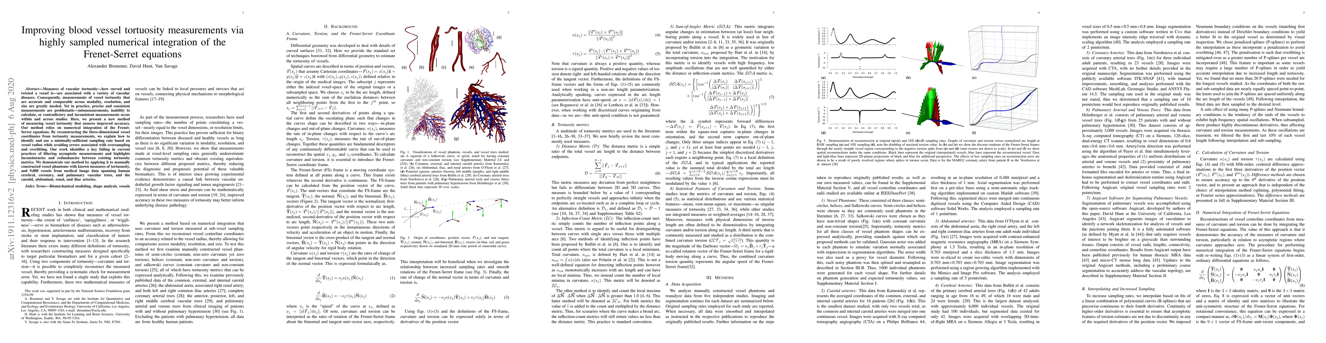 Measures of vascular tortuosity--how curved and twisted a vessel is--are associated with a variety of vascular diseases. Consequently, measurements of vessel tortuosity that are accurate and comparable across modality, resolution, and size are greatly needed. Yet in practice, precise and consistent measurements are problematic--mismeasurements, inability to calculate, or contradictory and inconsistent measurements occur within and across studies. Here, we present a new method of measuring vessel tortuosity that ensures improved accuracy. Our method relies on numerical integration of the Frenet-Serret equations. By reconstructing the three-dimensional vessel coordinates from tortuosity measurements, we explain how to identify and use a minimally-sufficient sampling rate based on vessel radius while avoiding errors associated with oversampling and overfitting. Our work identifies a key failing in current practices of filtering asymptotic measurements and highlights inconsistencies and redundancies between existing tortuosity metrics. We demonstrate our method by applying it to manually constructed vessel phantoms with known measures of tortuousity, and 9,000 vessels from medical image data spanning human cerebral, coronary, and pulmonary vascular trees, and the carotid, abdominal, renal, and iliac arteries.