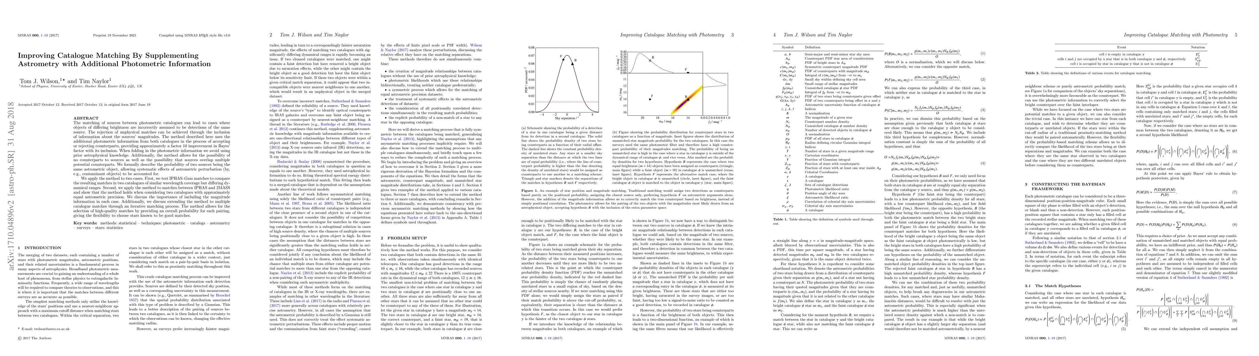 The matching of sources between photometric catalogues can lead to cases where objects of differing brightness are incorrectly assumed to be detections of the same source. The rejection of unphysical matches can be achieved through the inclusion of information about the sources' magnitudes. The method described here uses the additional photometric information from both catalogues in the process of accepting or rejecting counterparts, providing approximately a factor 10 improvement in Bayes' factor with its inclusion. When folding in the photometric information we avoid using prior astrophysical knowledge. Additionally, the method allows for the possibility of no counterparts to sources as well as the possibility that sources overlap multiple potential counterparts. We formally describe the probability of two sources being the same astrometric object, allowing systematic effects of astrometric perturbation (by, e.g., contaminant objects) to be accounted for. We apply the method to two cases. First, we test IPHAS-Gaia matches to compare the resulting matches in two catalogues of similar wavelength coverage but differing dynamical ranges. Second, we apply the method to matches between IPHAS and 2MASS and show that the method holds when considering two catalogues with approximately equal astrometric precision. We discuss the importance of including the magnitude information in each case. Additionally, we discuss extending the method to multiple catalogue matches through an iterative matching process. The method allows for the selection of high-quality matches by providing an overall probability for each pairing, giving the flexibility to choose stars known to be good matches.