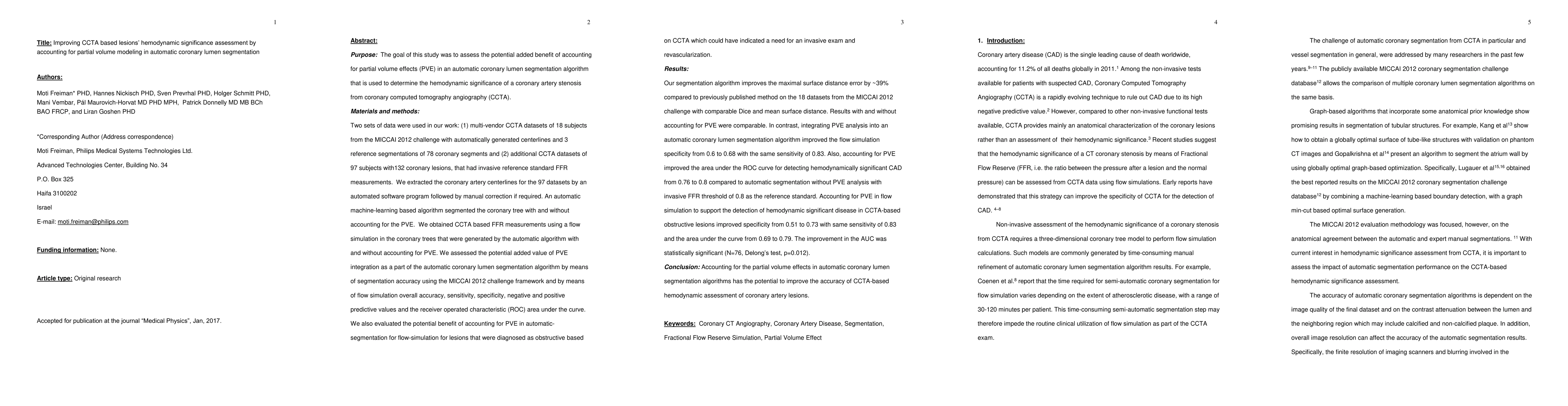 This study evaluates the integration of partial volume effects (PVE) in automatic coronary lumen segmentation algorithms for coronary computed tomography angiography (CCTA), finding improved flow simulation specificity and accuracy in detecting hemodynamically significant coronary artery disease (CAD). The results suggest PVE accounting enhances the diagnostic potential of CCTA for assessing lesion significance.