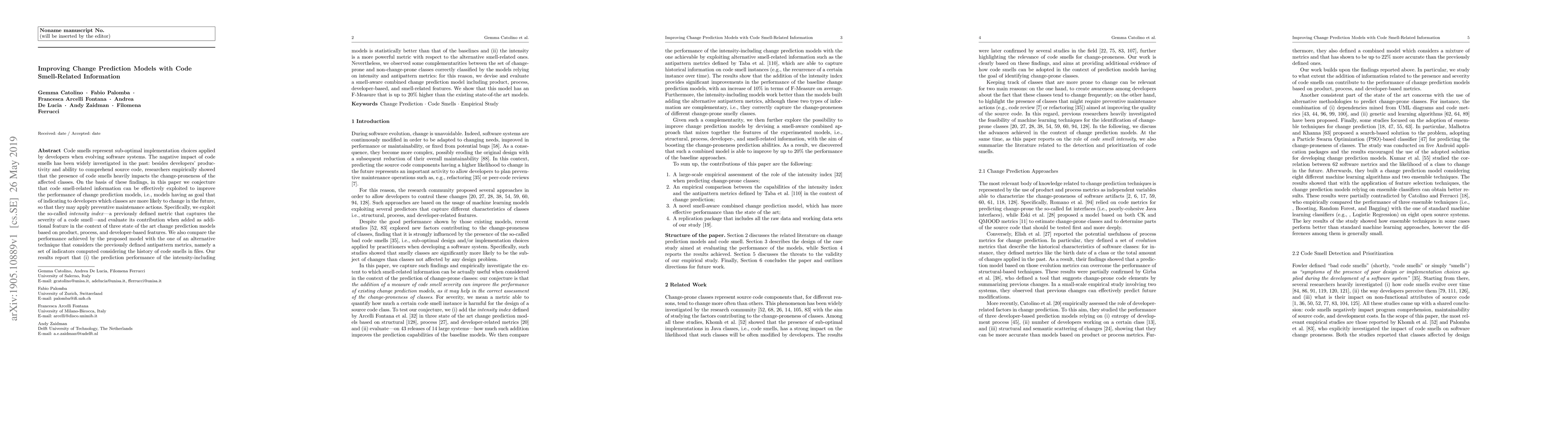 This paper investigates the use of code smell-related information, specifically the intensity index, to enhance change prediction models. The results show that incorporating the intensity index as a feature improves prediction performance compared to baseline models and alternative antipattern metrics.