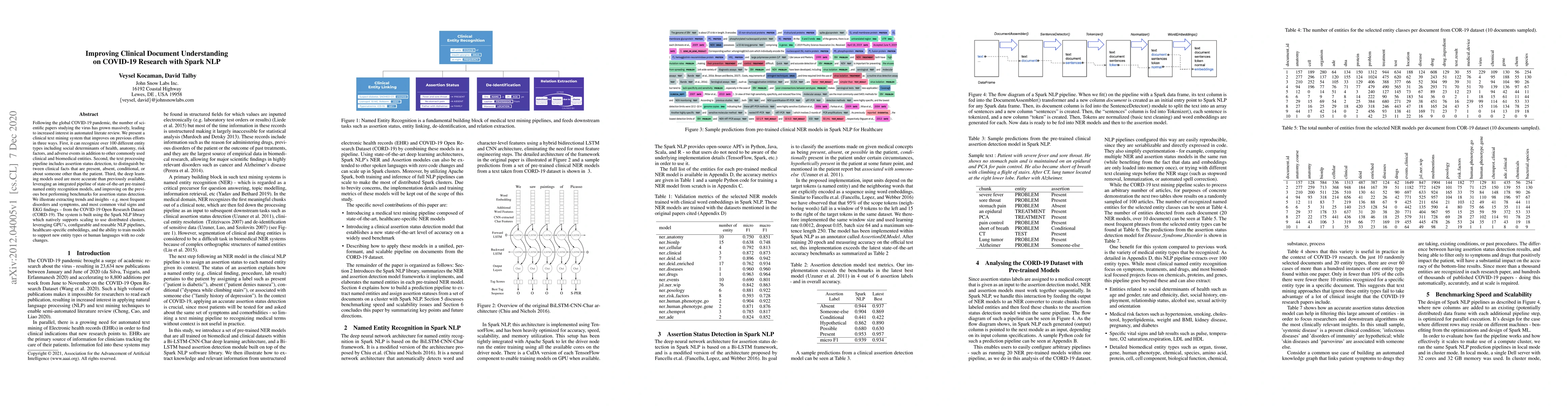 Following the global COVID-19 pandemic, the number of scientific papers studying the virus has grown massively, leading to increased interest in automated literate review. We present a clinical text mining system that improves on previous efforts in three ways. First, it can recognize over 100 different entity types including social determinants of health, anatomy, risk factors, and adverse events in addition to other commonly used clinical and biomedical entities. Second, the text processing pipeline includes assertion status detection, to distinguish between clinical facts that are present, absent, conditional, or about someone other than the patient. Third, the deep learning models used are more accurate than previously available, leveraging an integrated pipeline of state-of-the-art pretrained named entity recognition models, and improving on the previous best performing benchmarks for assertion status detection. We illustrate extracting trends and insights, e.g. most frequent disorders and symptoms, and most common vital signs and EKG findings, from the COVID-19 Open Research Dataset (CORD-19). The system is built using the Spark NLP library which natively supports scaling to use distributed clusters, leveraging GPUs, configurable and reusable NLP pipelines, healthcare specific embeddings, and the ability to train models to support new entity types or human languages with no code changes.