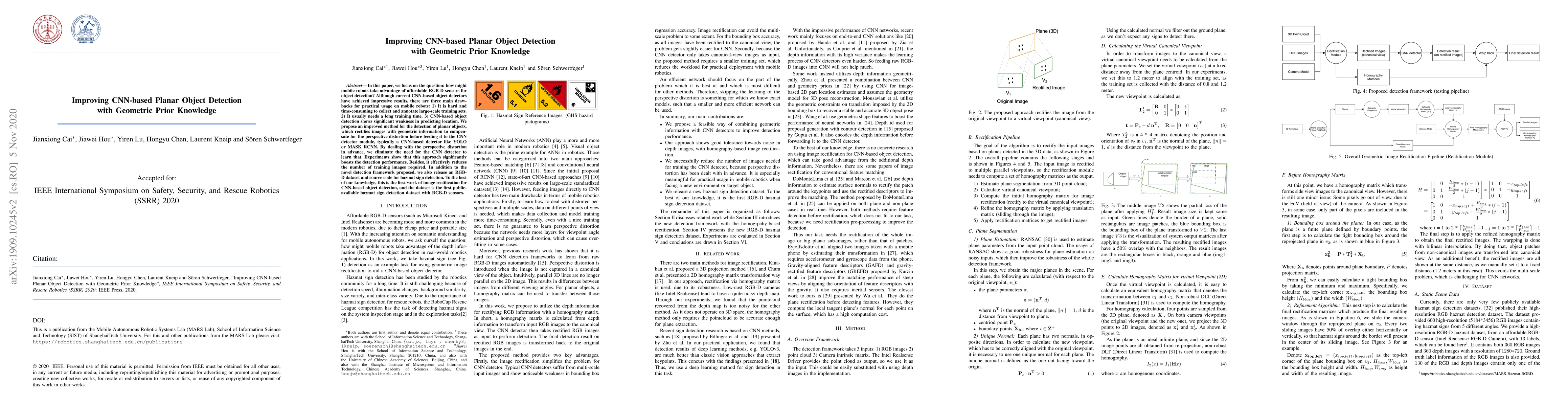 In this paper, we focus on the question: how might mobile robots take advantage of affordable RGB-D sensors for object detection? Although current CNN-based object detectors have achieved impressive results, there are three main drawbacks for practical usage on mobile robots: 1) It is hard and time-consuming to collect and annotate large-scale training sets. 2) It usually needs a long training time. 3) CNN-based object detection shows significant weakness in predicting location. We propose an improved method for the detection of planar objects, which rectifies images with geometric information to compensate for the perspective distortion before feeding it to the CNN detector module, typically a CNN-based detector like YOLO or MASK RCNN. By dealing with the perspective distortion in advance, we eliminate the need for the CNN detector to learn that. Experiments show that this approach significantly boosts the detection performance. Besides, it effectively reduces the number of training images required. In addition to the novel detection framework proposed, we also release an RGBD dataset and source code for hazmat sign detection. To the best of our knowledge, this is the first work of image rectification for CNN-based object detection, and the dataset is the first public available hazmat sign detection dataset with RGB-D sensors.
