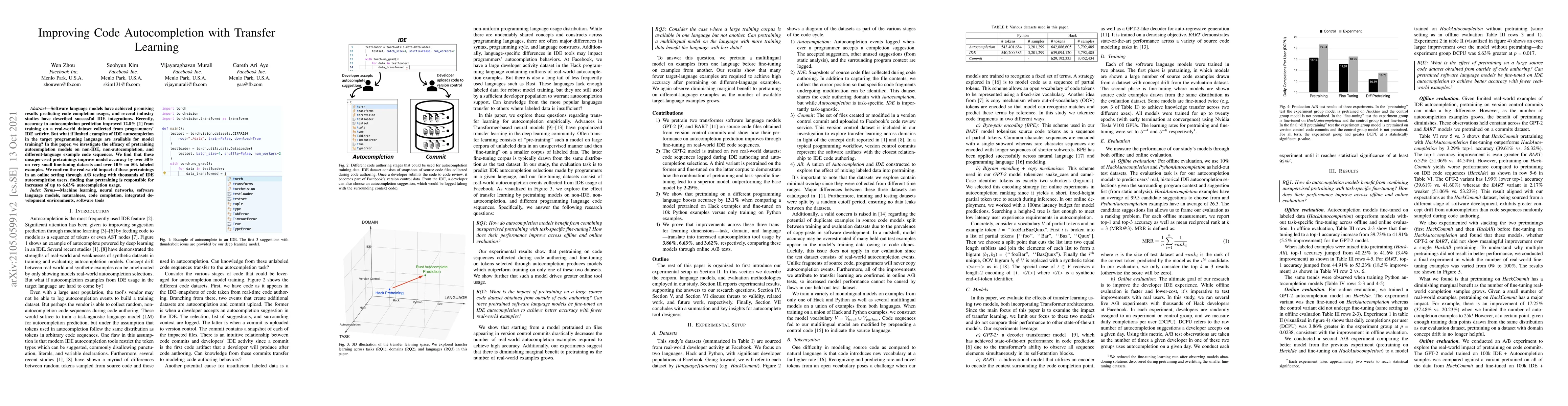 This paper explores the use of transfer learning to enhance code autocompletion models. By pretraining on non-IDE, non-autocompletion, and different-language code sequences, the models showed a significant improvement of over 50% accuracy with very small fine-tuning datasets, and over 10% with 50k labeled examples. Real-world A/B testing confirmed that pretraining led to up to 6.63% increase in autocompletion usage.