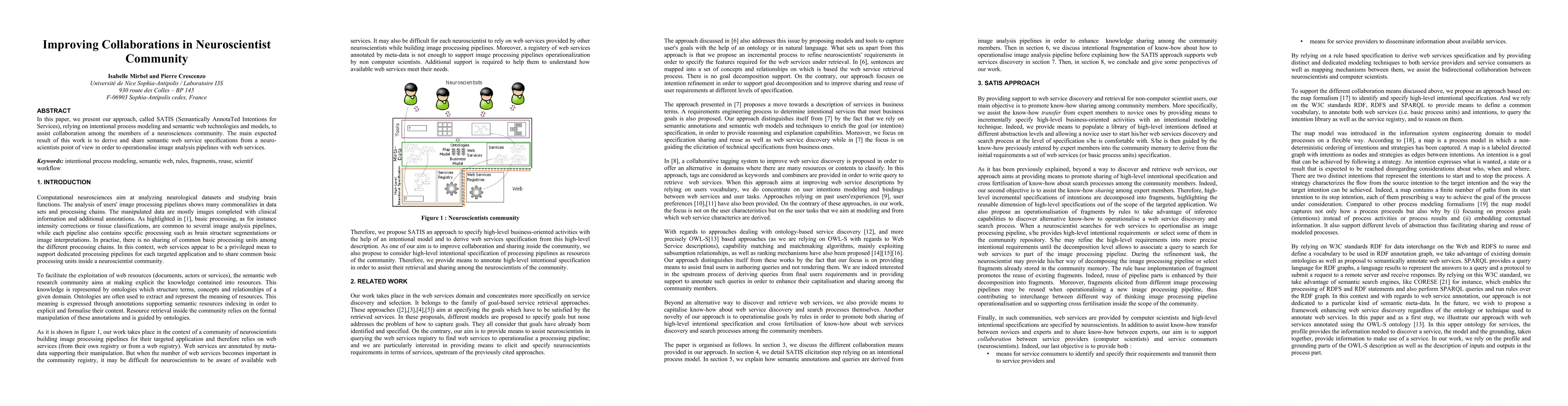 In this paper, we present our approach, called SATIS (Semantically AnnotaTed Intentions for Services), relying on intentional process modeling and semantic web technologies and models, to assist collaboration among the members of a neurosciences community. The main expected result of this work is to derive and share semantic web service specifications from a neuro-scientists point of view in order to operationalise image analysis pipelines with web services.
