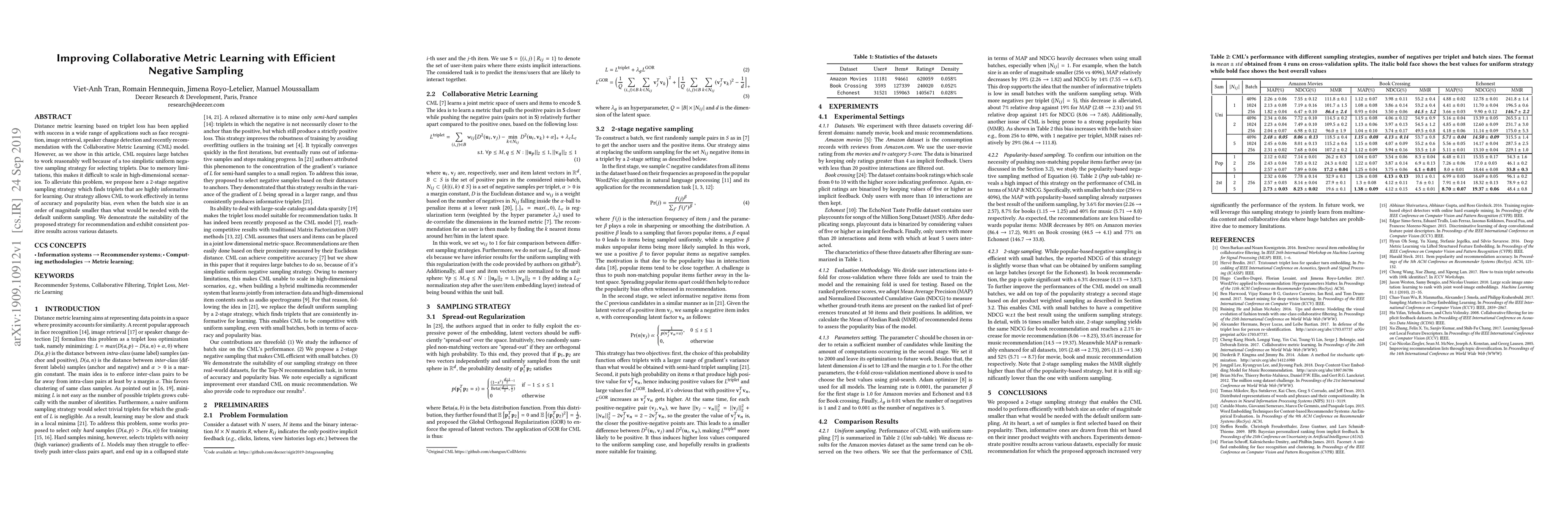 Distance metric learning based on triplet loss has been applied with success in a wide range of applications such as face recognition, image retrieval, speaker change detection and recently recommendation with the CML model. However, as we show in this article, CML requires large batches to work reasonably well because of a too simplistic uniform negative sampling strategy for selecting triplets. Due to memory limitations, this makes it difficult to scale in high-dimensional scenarios. To alleviate this problem, we propose here a 2-stage negative sampling strategy which finds triplets that are highly informative for learning. Our strategy allows CML to work effectively in terms of accuracy and popularity bias, even when the batch size is an order of magnitude smaller than what would be needed with the default uniform sampling. We demonstrate the suitability of the proposed strategy for recommendation and exhibit consistent positive results across various datasets.