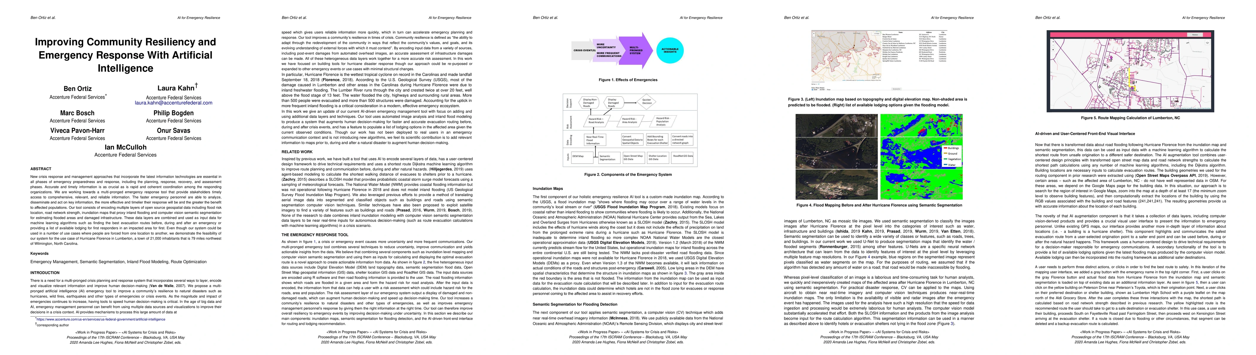 New crisis response and management approaches that incorporate the latest information technologies are essential in all phases of emergency preparedness and response, including the planning, response, recovery, and assessment phases. Accurate and timely information is as crucial as is rapid and coherent coordination among the responding organizations. We are working towards a multipronged emergency response tool that provide stakeholders timely access to comprehensive, relevant, and reliable information. The faster emergency personnel are able to analyze, disseminate and act on key information, the more effective and timelier their response will be and the greater the benefit to affected populations. Our tool consists of encoding multiple layers of open source geospatial data including flood risk location, road network strength, inundation maps that proxy inland flooding and computer vision semantic segmentation for estimating flooded areas and damaged infrastructure. These data layers are combined and used as input data for machine learning algorithms such as finding the best evacuation routes before, during and after an emergency or providing a list of available lodging for first responders in an impacted area for first. Even though our system could be used in a number of use cases where people are forced from one location to another, we demonstrate the feasibility of our system for the use case of Hurricane Florence in Lumberton, North Carolina.
