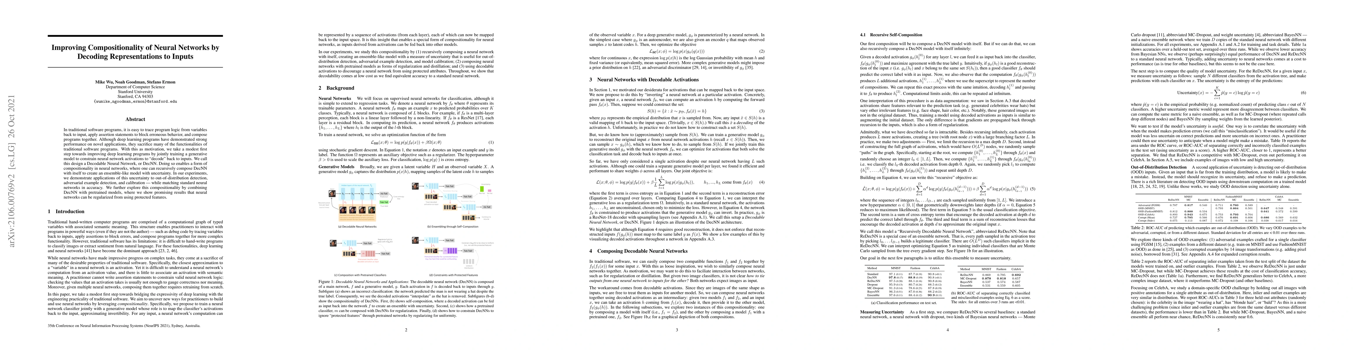 In traditional software programs, it is easy to trace program logic from variables back to input, apply assertion statements to block erroneous behavior, and compose programs together. Although deep learning programs have demonstrated strong performance on novel applications, they sacrifice many of the functionalities of traditional software programs. With this as motivation, we take a modest first step towards improving deep learning programs by jointly training a generative model to constrain neural network activations to "decode" back to inputs. We call this design a Decodable Neural Network, or DecNN. Doing so enables a form of compositionality in neural networks, where one can recursively compose DecNN with itself to create an ensemble-like model with uncertainty. In our experiments, we demonstrate applications of this uncertainty to out-of-distribution detection, adversarial example detection, and calibration -- while matching standard neural networks in accuracy. We further explore this compositionality by combining DecNN with pretrained models, where we show promising results that neural networks can be regularized from using protected features.