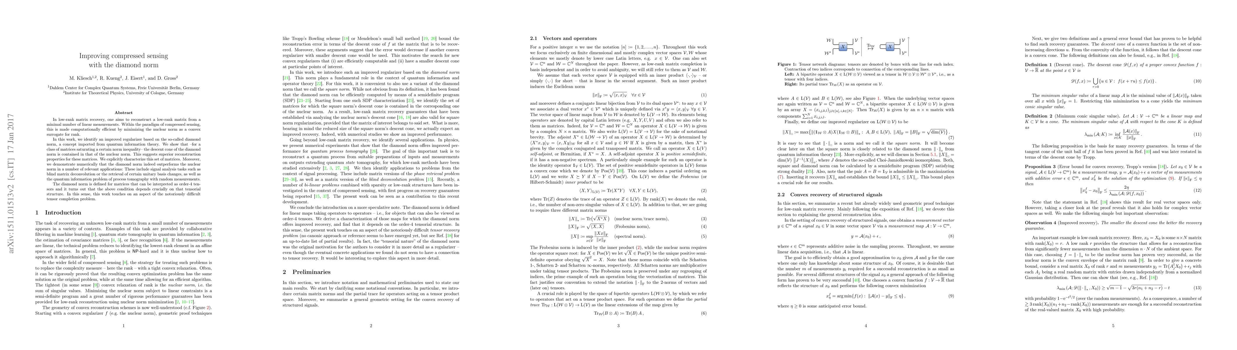 This paper proposes using the diamond norm, a concept from quantum information theory, as an improved regularizer for low-rank matrix recovery in compressed sensing. It demonstrates that the diamond norm outperforms the nuclear norm in reconstructing matrices that satisfy a specific norm inequality, showing superior performance in applications like signal analysis and quantum process tomography.