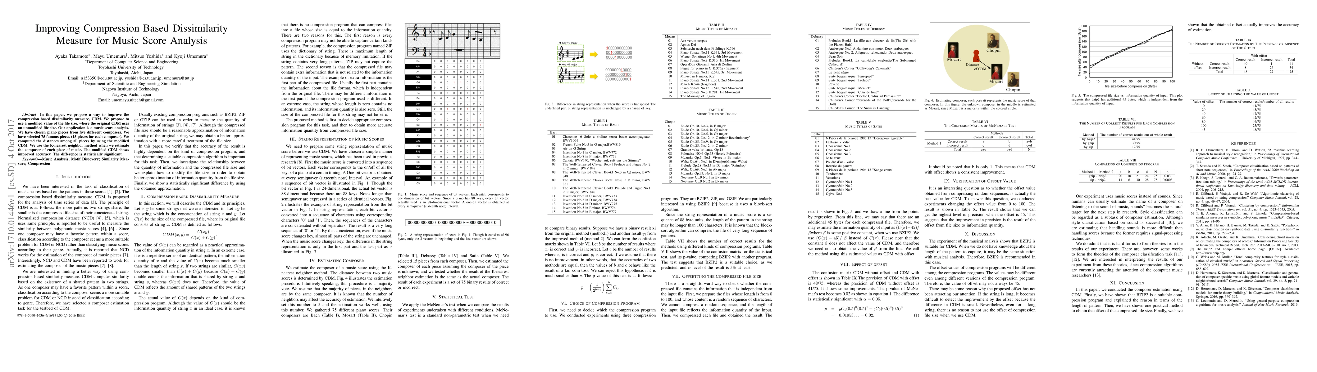 In this paper, we propose a way to improve the compression based dissimilarity measure, CDM. We propose to use a modified value of the file size, where the original CDM uses an unmodified file size. Our application is a music score analysis. We have chosen piano pieces from five different composers. We have selected 75 famous pieces (15 pieces for each composer). We computed the distances among all pieces by using the modified CDM. We use the K-nearest neighbor method when we estimate the composer of each piece of music. The modified CDM shows improved accuracy. The difference is statistically significant.