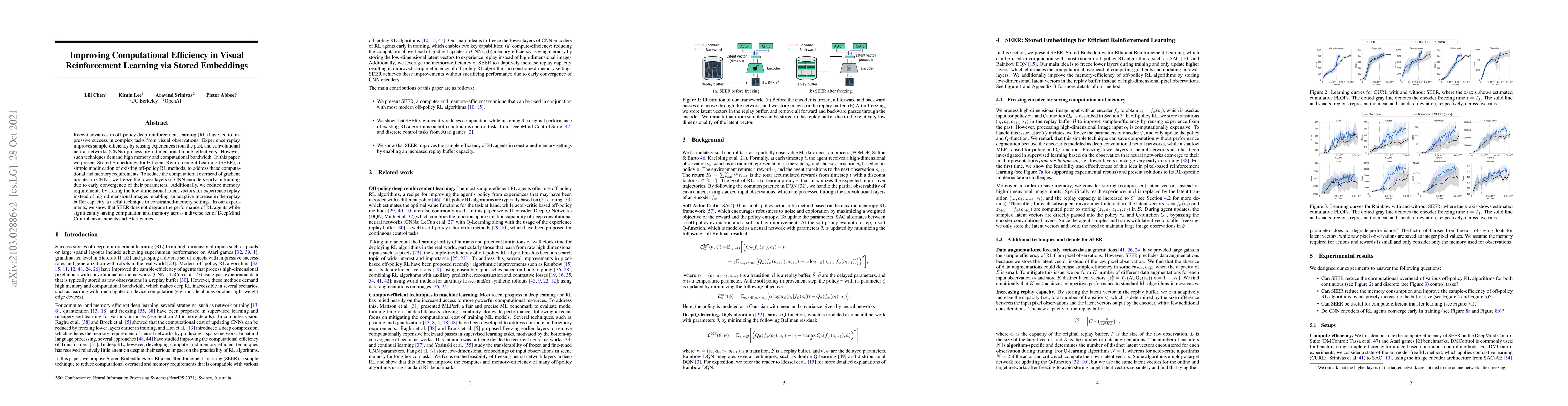 This paper proposes Stored Embeddings for Efficient Reinforcement Learning (SEER) to enhance computational efficiency in visual reinforcement learning. SEER modifies off-policy RL techniques by freezing lower layers of CNNs early in training and storing low-dimensional latent vectors instead of high-dimensional images, achieving significant memory and computational savings without compromising performance.